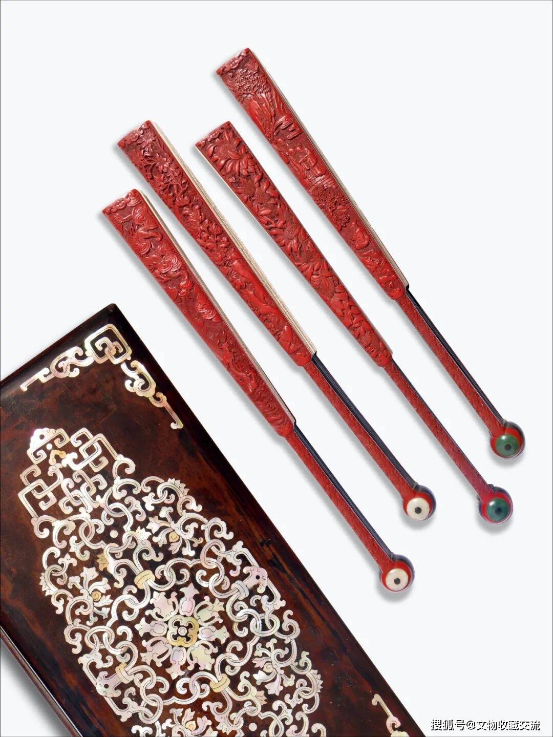 本品一函四把,涵嵌螺钿宝相花绘,富丽堂皇。扇骨十三档,圆头式,圆钉,以竹为胎、剔红工艺而制,四把两面皆剔红雕会昌九老图、云龙纹、九秋图、荔枝纹图,画意明晰,格调古雅,极具文人气息。亭台楼阁,瑞松摇曳,高士或执杖,或围坐于案前对弈观棋,神态各异,相得益彰;