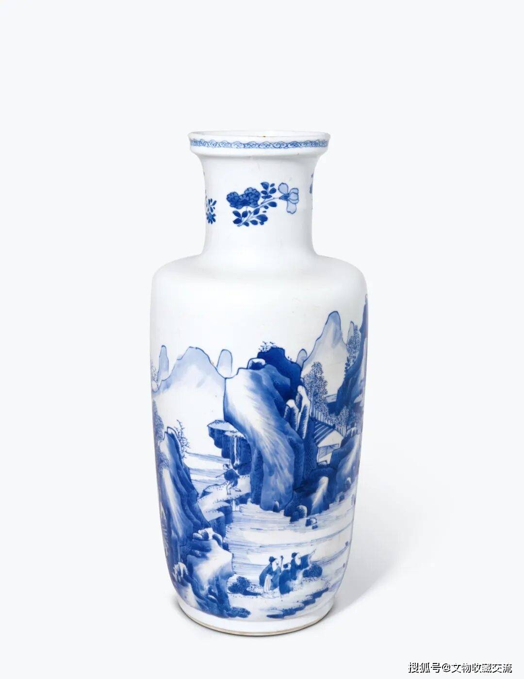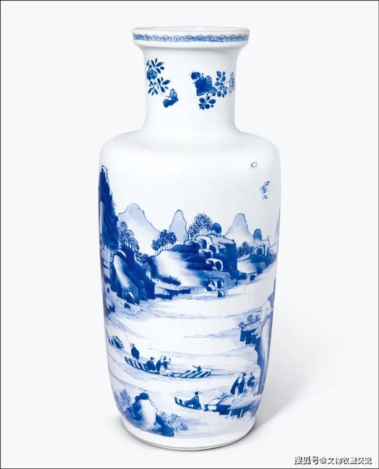 棒槌瓶为顺治、康熙时期的创新器型,瓶腹平缓,适合展示瓷画之美,故广为流行。本品以分水皴技法绘就,运笔流畅娴熟,颇具水墨神韵,其青花呈色浓淡有致,远近景层次分明,充分展现出熙朝青花之独特魅力。其属于此时最典型的装饰纹样之一。
