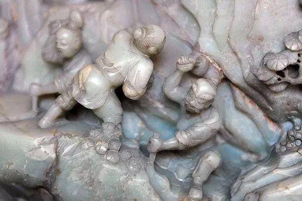 整座玉山上,雕琢了众多人物,活动都围绕治水展开,人们穿着粗布麻衣,有的干脆光着上身,抡起橛子,劈山移土,脊背、腿上的肌肉随着动作的展开爆发出力量。