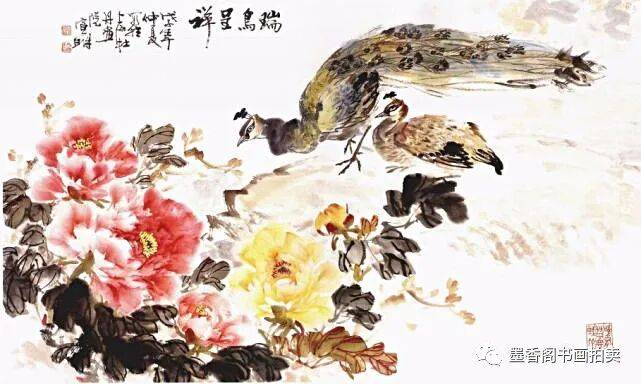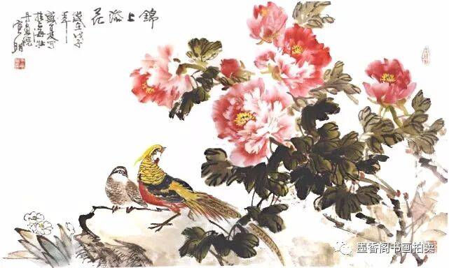 锦鸡又称金鸡,形体优美,羽色鲜亮华丽,民间誉为吉祥鸟。在传统绘画中锦鸡与牡丹为伍,寓意锦上添花,好上加好。