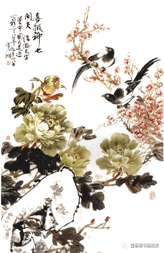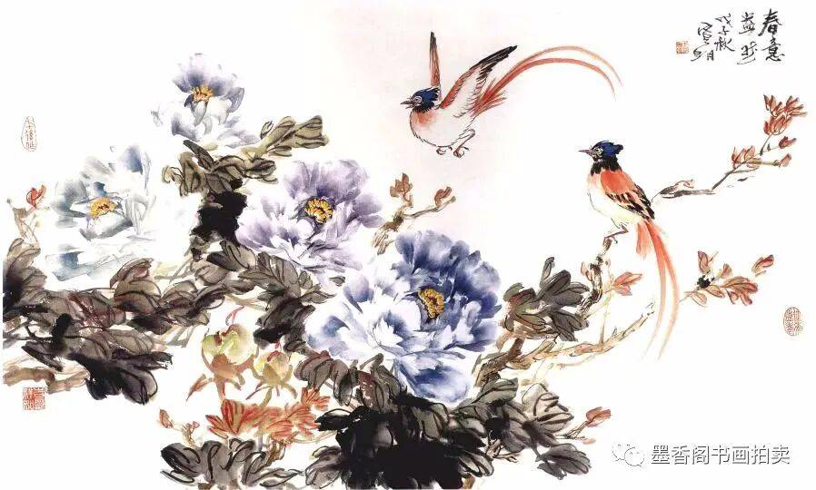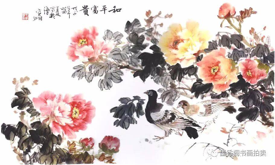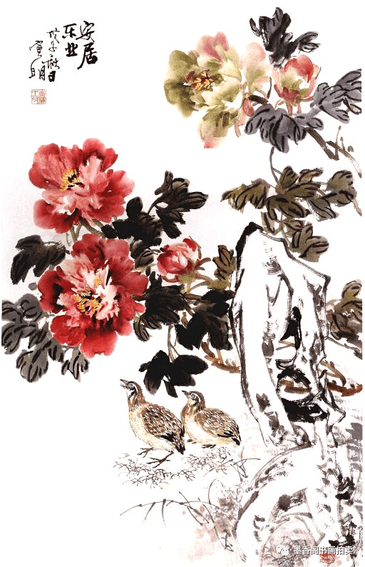 这是一幅鹌鹑与牡丹为伍的传统寓意题材画,鹌鹑是以勇敢为标志的吉祥鸟,因“鹌”与“安”同音,故民间以鹌鹑配以牡丹,寓安居富贵之意,也有祝贺乔迁新居之意。