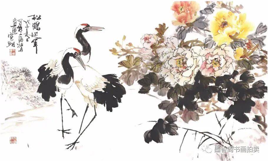 丹顶鹤是吉祥、嘉瑞的象征,因其头顶上有红色肉疣而得名。鹤是鸟类中的长寿者,故在民间鹤与“寿”和“福”相联。此图鹤配以牡丹,再在左侧面以松树,象征松龄鹤寿,富贵长寿。