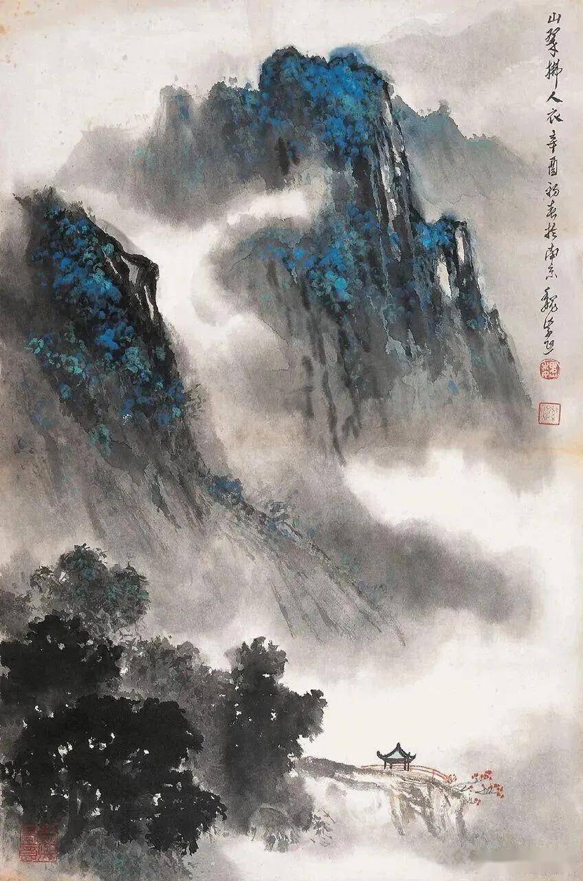 构图烟云缭绕,山峦如在云间浮游,亭台翼然,若仙人之居。技法上,以泼墨写云,缥缈虚幻,复以青蓝染山,翠色氤氲,如 “只在此山中,云深不知处” 之幽秘。