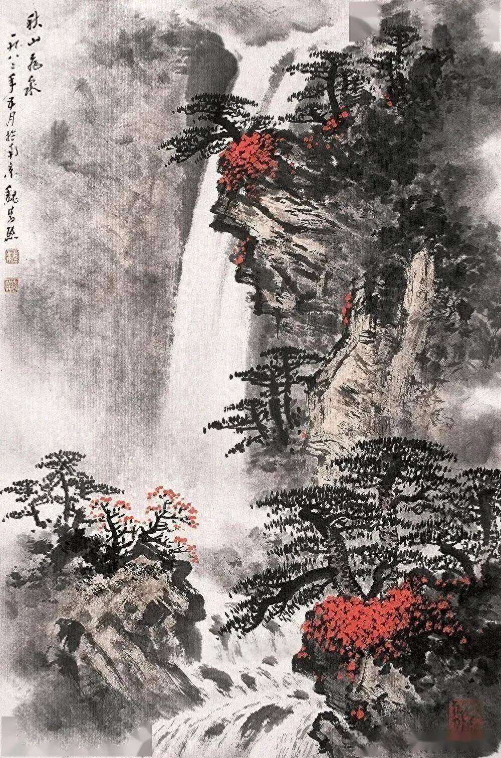 构图奇崛,飞瀑自绝巘倾泻而下,如银河落九天,其势雄阔。技法上,以枯笔勾勒松枝,虬曲苍劲,如屈子笔下 “后皇嘉树,橘徕服兮” 之橘,坚韧不屈;又以朱砂点染丹枫,似烈火燃于幽壑。飞瀑之水,灵动跳脱,恰应 “飞流直下三千尺,疑是银河落九天” 之壮美。
