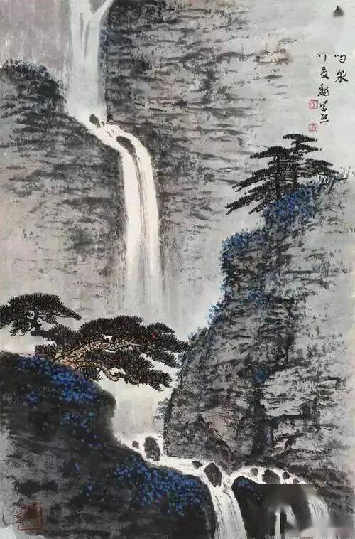构图简洁,却意境深远,飞瀑分作数叠,如素练垂空,松枝横斜,如高士策杖。技法上,以浓墨写松,如郑板桥笔下之竹,有傲然风骨;又以青蓝点苔,为冷峻之景添生机。