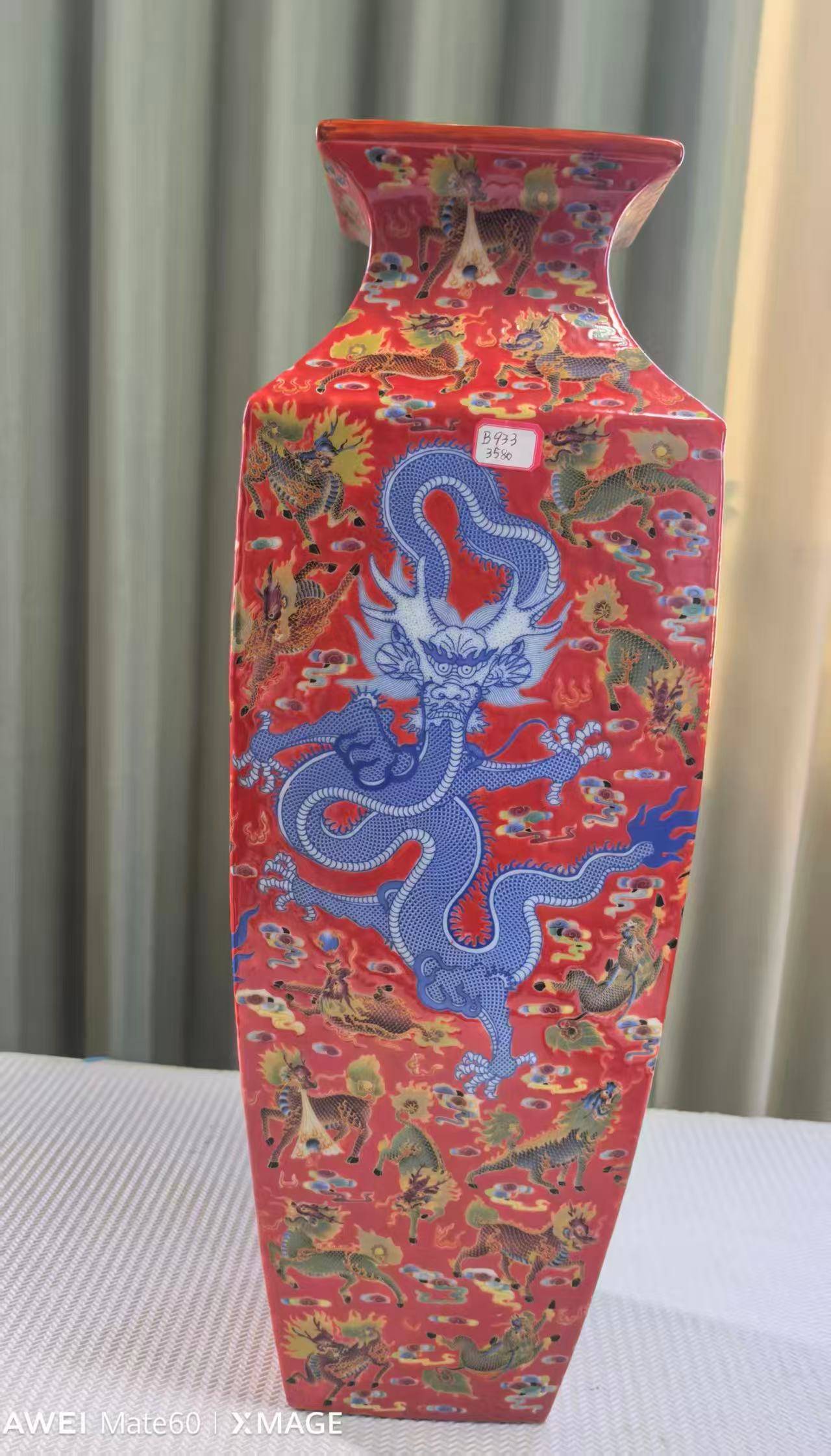 在中国陶瓷艺术的璀璨星河中,这件红地粉彩龙纹麒麟方瓶以其鲜明的色彩、繁复的纹饰和独特的器型,成为传统工艺与文化寓意交融的典型代表。它不仅是一件陈设器物,更是承载着中国古代祥瑞文化、工艺美学与皇权象征的立体载体,以下从器型、纹饰、工艺、文化寓意等维度展开详细解析。