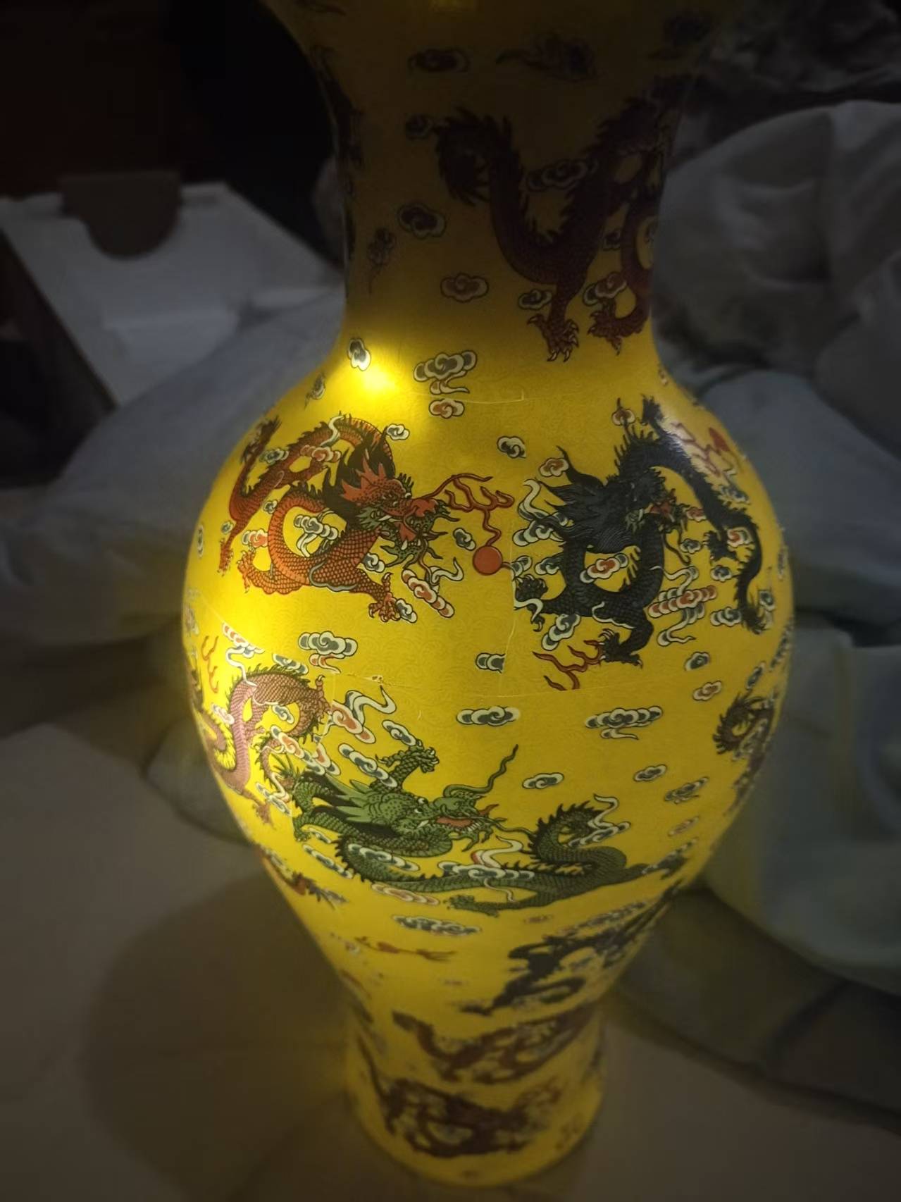 九龙纹饰: 瓶身描绘的九条龙,是工艺与艺术的极致展现。龙纹采用勾勒填彩的方法,线条刚劲有力,龙首威严,龙身矫健,鳞片描绘一丝不苟,在黄地的映衬下,极具视觉冲击力。九龙姿态各异,升降交错,穿行于云海或火焰之中,构图繁而不乱,充满动感与力量,充分展现了御窑画师高超的绘画功力。