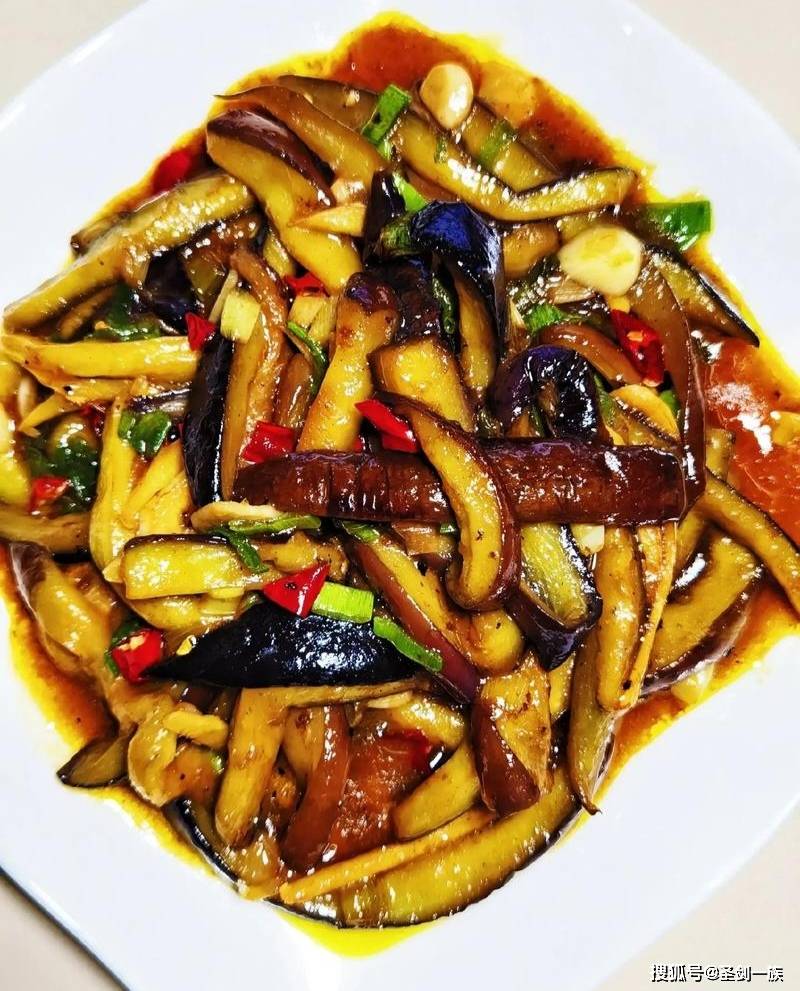 2 另起锅烧油,蒜末爆香,放入茄子,加盐,鸡精,生抽,蚝油,白糖,醋,调味,放入辣椒丝,爆炒5分钟,撒葱段,炒匀出锅,家常好吃的下饭菜。