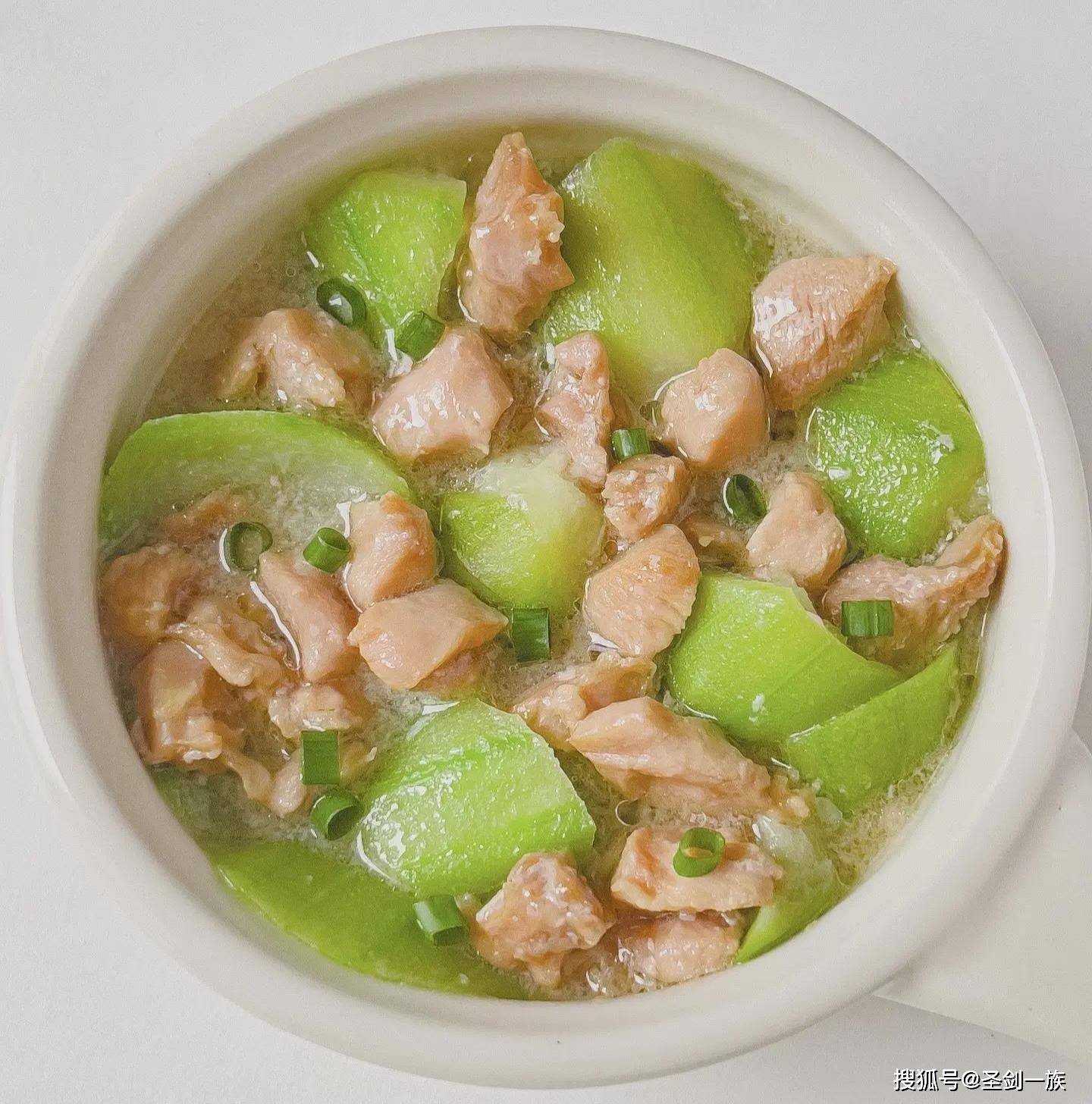 2. 丝瓜去皮切滚刀块,铺在碗底,上面摆腌好的鸡腿肉,再撒点胡萝卜丝;