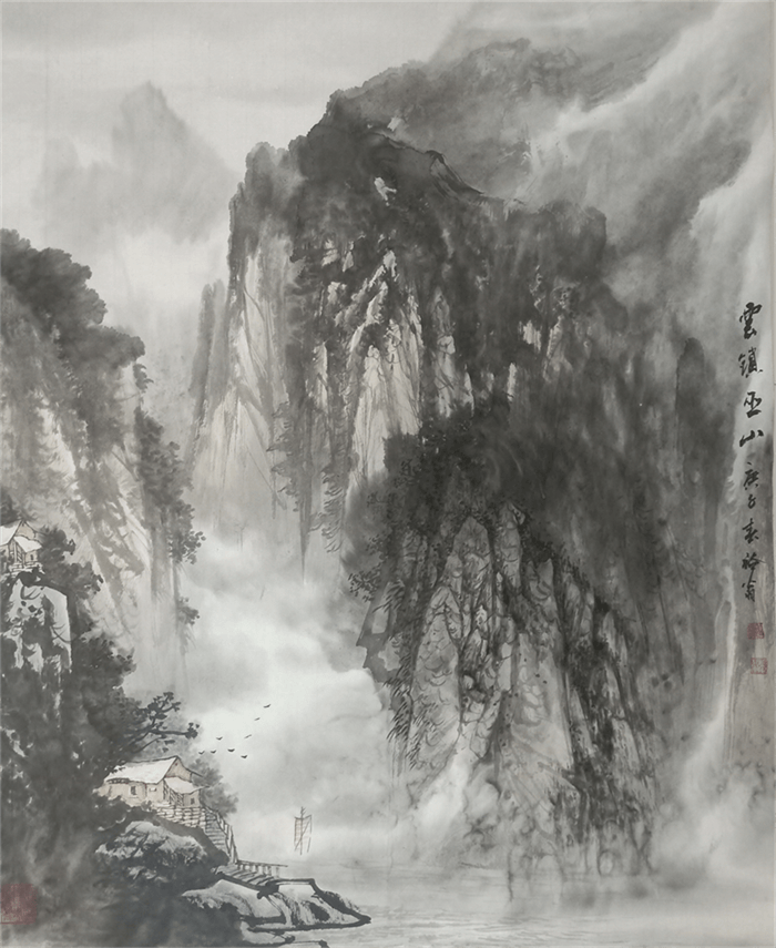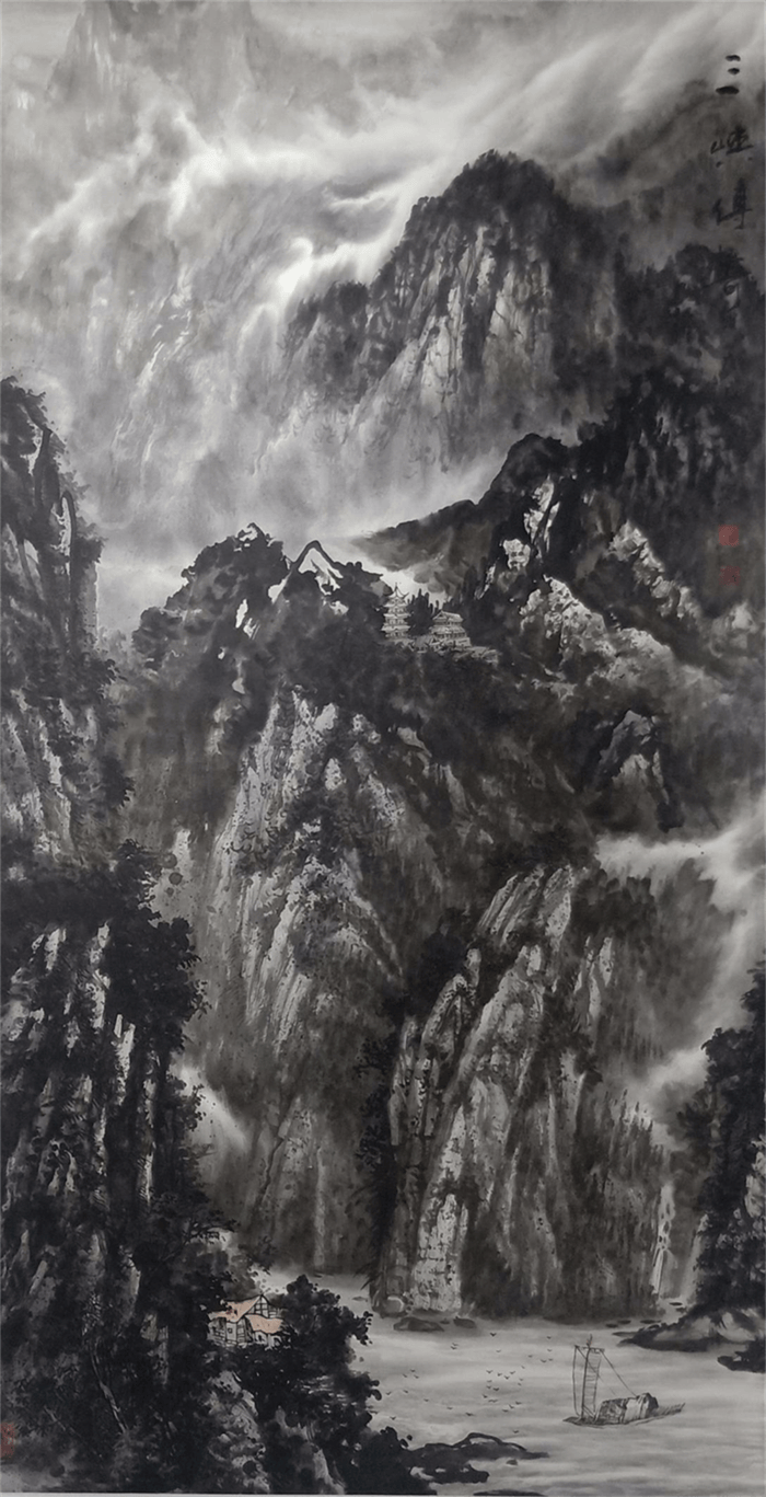 新时期审美是中西对比融合的多元态势,国画以线为基、重阴阳虚实,具主观生命力,却在理性空间构建上弱于西画。张建国早年先学西画再攻国画,创作呈“中西兼顾、体用互置”自觉——使笔运锋随地貌而变:画瞿塘峡陡崖侧锋挥扫,摹江水冲刷之粗砺而沧桑肌理;绘嘉陵江浅滩中锋细勾,显沙岸流水柔润弧度。更将斧劈皴雄劲与披麻皴细腻融得浑然:化斧劈皴为墨块堆叠巫峡群峰之浑厚质感,借披麻皴斜式短线顺山脉走势皴擦,以线条疏密对比显巴渝山地灵动,横鳞竖勒,非纯斧劈、亦非全披麻,恰衬峡江“雄中藏秀”之特质,正是他早年“先访人文再观山水”所悟的观察范式,在创作笔墨上的落地。其运笔稳健中含藏节奏起伏之势:写烟云时笔锋轻提,墨色由浓转淡如行云流水;刻画山石肌理时笔锋顿挫,枯湿浓淡交替,干笔皴擦显苍劲,湿墨渲染出氤氲,写意洒脱与写实精微,在此间达成平衡。设色素来淡雅,赭石、花青只作“点染”,色不碍墨,气韵自生,却让峡江阴晴向背、四季荣枯,在素净笔墨里有了鲜活呼吸。
