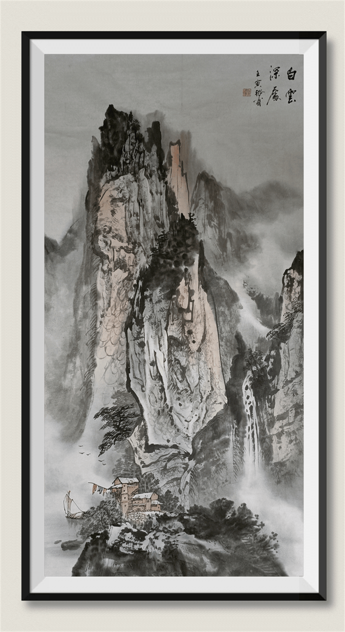 这般笔墨背后,是张建国对峡江人文与自然的深度共情——他把“先访故事人文再动笔”的理念揉贯长卷创作:《乌江画廊》《天生三桥》长卷里,江水串起滩头、民居吊脚楼与古栈道;栈道曲折蜿蜒,似有纤夫残影;浪涌江声,木船系载着川江号子余韵。“山缠万道水,水绕千重山”——他画的山,是见证江水奔涌的巨龙;画的水,载着岁月悠悠兴替。瞿塘峡滟滪堆的险、白帝城的文脉、峡江人“生于斯、困于斯、爱于斯”的纠缠,都被提炼成笔墨意象:山势重“开合聚散”,层次如地质褶皱般有张力;江、船、山、屋,诉说着“走得出水路,走不出乡愁”。