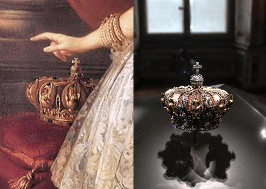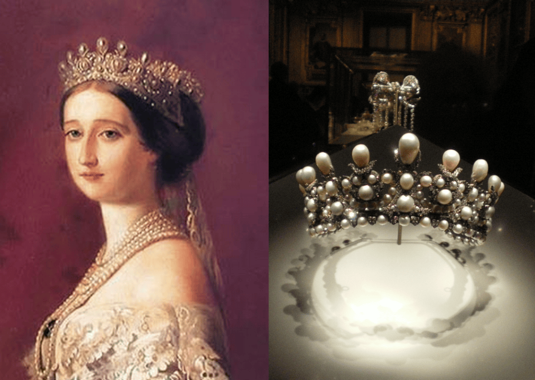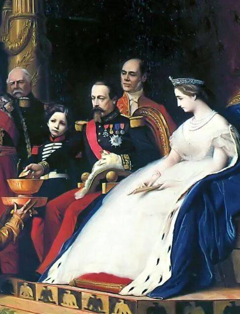 比如油画中戴过的这顶钻石珍珠冠冕,是欧仁妮和拿破仑三世的新婚礼物,镶嵌212颗珍珠、1998颗钻石,陪伴了她17年之久。