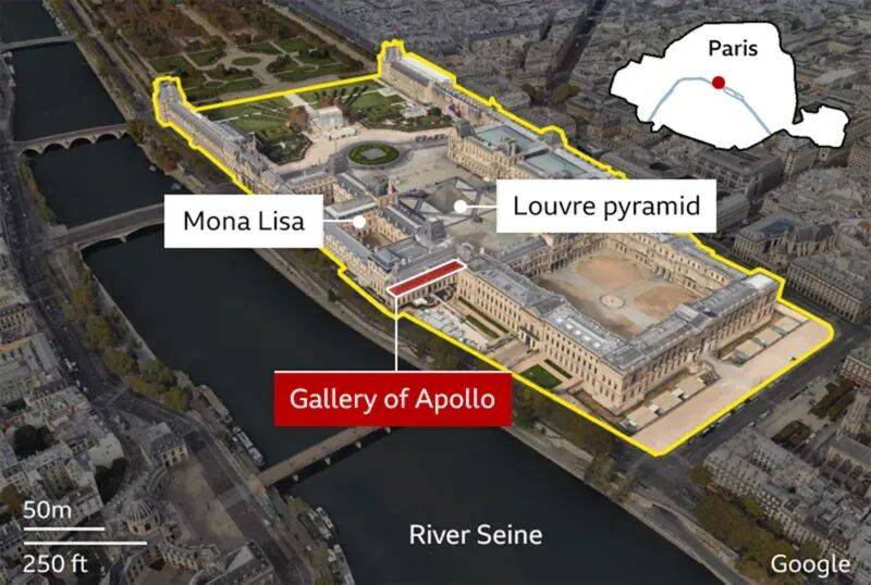 两人头戴巴拉克拉法帽,身穿黄色背心伪装成建筑工人,并通过升降机和切割机破窗进入卢浮宫二楼,另两名同伙则驾驶雅马哈TMAX摩托车楼下接应。
