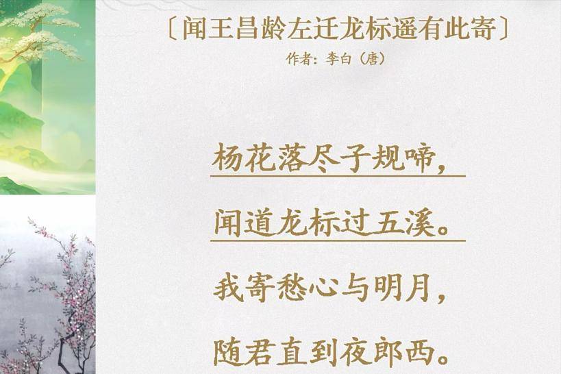 还有那天上的明月,也经常会成为李白写诗时的帮手,就比如在《闻王昌龄左迁龙标遥有此寄》中有一句“我寄愁心与明月,随君直到夜郎西”。
