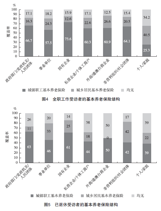 据人力资源和社会保障部统计,截至2023年底,全国基本养老保险参保人数已达10.067亿人,相较于2011年增长了73.2%,形成了全球规模最大的养老保险体系。在城镇职工基本养老保险的具体覆盖情况中,来自国有企业、政府部门/党政机关/人民团体的受访者拥有最高的参保率;处于全职工作状态的受访者相较于已退休受访者,具有更高的城镇职工基本养老保险参保率。从整体基本养老保险的覆盖情况来看,全职工作受访者的基本养老保险参保率同样高于已退休受访者的(见图4和图5)。