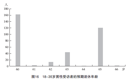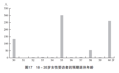 在18~35岁的青年群体中,男性的预期退休年龄主要集中在60岁和65岁,平均为62岁;女性的预期退休年龄主要集中在55岁和60岁,平均为56岁(见图16和图17)。虽然政策规定男性的退休年龄逐步延至63岁,女性的退休年龄延至55岁和58岁,但调研显示,56.54%的青年受访者(男性为51.59%,女性为58.77%)倾向于提前退休;仅34.63%的受访者(男性为35.65%,女性为34.16%)预期延迟退休。这表明青年群体对提前退休的偏好较强,可能与社会普遍接受度、对退休生活的向往以及工作压力有关。