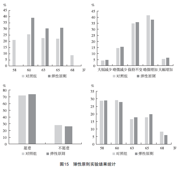 结果显示,在实验组中,38.93%的受访者选择在60岁退休,30.29%的受访者选择在63岁按时退休;在对照组中,选择提前退休(58岁和60岁)的受访者占比为46.53%。这表明,虽然受访者普遍倾向于提前退休,但在更窄的退休窗口内,提前退休的倾向有所减弱,更多受访者选择在基准退休年龄退休。这一现象说明,通过限制选择范围的弹性原则,能够更有效地引导受访者作出与政策方向一致的决策。