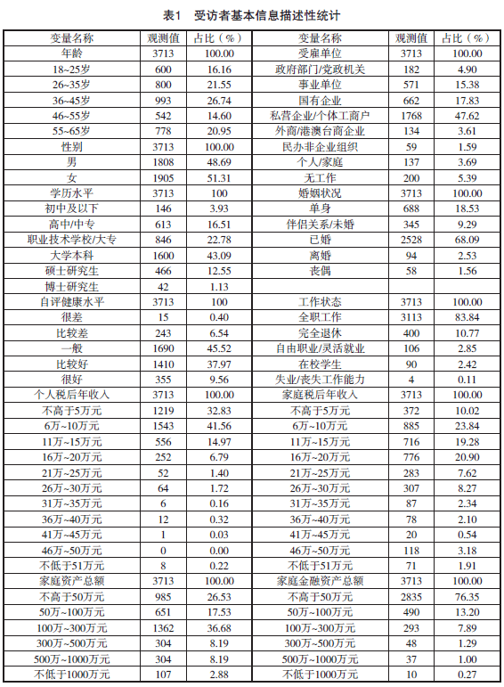 本次调研采用分层随机抽样方法,由瀚一数据科技(深圳)有限公司负责问卷的植入与回收。问卷通过微信公众号平台“调研家社区”发布,受访者在线独立填写。调研时间为2024年9—10月,共回收有效问卷3713份,覆盖中国大陆31个省份及地区,其中在职职工3313名(占比约为90%),退休居民400名(占比约为10%)。调研内容涵盖五个方面:基本信息(年龄、性别、居住地区等)、退休生活愿景(预期退休年龄、养老方式偏好等)、退休准备指数(退休责任意识、财务规划认知水平等)、退休财务规划(养老金积累方式、财务准备方式等)以及专题研究(金融素养、风险态度、对延迟退休政策的态度等)。
