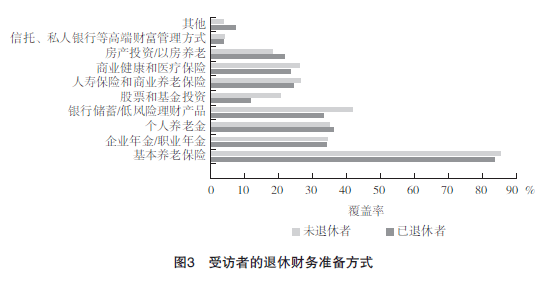 退休财务准备是理解居民养老准备情况和我国养老金融体系建设需求的重要支撑,基于此,本次调研对未退休和已退休的受访者进行了调查,询问未退休(已退休)受访者在当前(退休前)采用了哪些金融工具为退休财务做准备。总体而言,基本养老保险、企业年金、个人养老金和银行储蓄/低风险理财产品为四种覆盖率最高的退休财务准备方式。