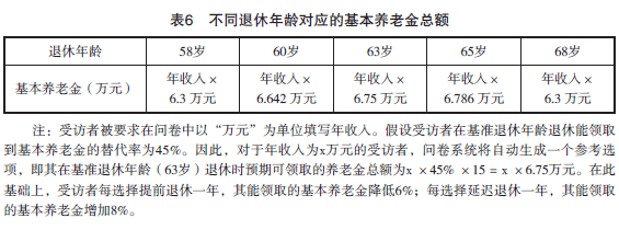 在本实验组中,依然设定基准退休年龄为63岁,但将受访者的退休时间选择范围限定为60~65岁,以便领取基本养老金(对照组的退休窗口为58~68岁)。养老金金额根据当前收入水平和退休年龄计算,以每月领取数额的形式呈现,与对照组保持一致。