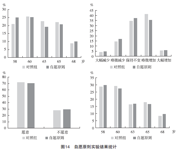 综上所述,在取消基准退休年龄限制的实验组中,受访者更倾向于提前退休,显示出对个人因素(如健康状况、生活质量)的重视。在储蓄方面,实验组增加退休储蓄的意愿有所减弱,表明缺乏基准退休年龄可能降低了对储蓄重要性的关注。两组受访者对商业养老年金的购买意愿仍然较高。在允许兼职的条件下,两组数据差异较小,整体上显示出在灵活的退休年龄选择下,受访者更倾向于提前退休,实现自主的生活规划(见图14)。