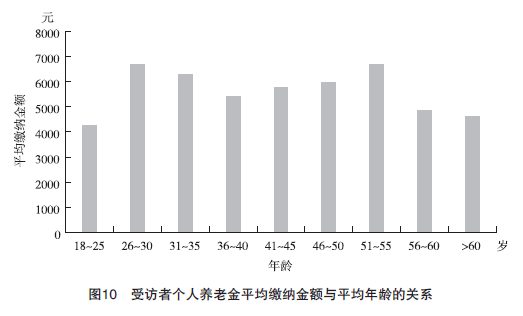 从年龄分布来看,26~55岁的受访者群体的个人养老金平均缴纳金额相对较高,尤其是26~35岁和51~55岁的受访者,他们的平均缴纳金额最高(见图10)。本文推测这一现象的原因可能与该年龄段群体的职业发展和财务规划有关。26~35岁的受访者正处于职业发展的黄金时期,对退休财务规划的需求较高,且对2022年推出的个人养老金政策有更深入的了解,因此,在个人养老金缴纳方面更为积极。