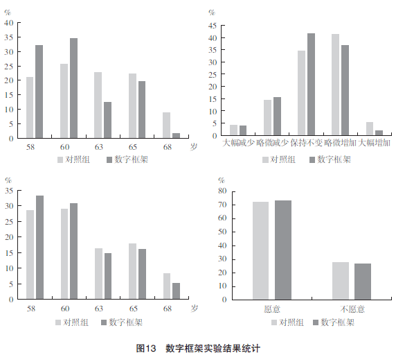 结果显示,实验组中选择58岁和60岁退休的受访者的比例为50.06%,略高于对照组的46.53%。这表明,取消基准退休年龄限制后,选择提前退休的受访者有所增加。由于缺乏特定年龄约束,受访者在决策时更注重自身健康状况、财务规划和生活质量等个人因素。这种灵活的选择空间使他们不再受限于制度化的退休标准,部分受访者因此选择较早退休,享受更长的退休生活。