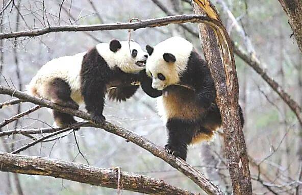 ▲秦岭大熊猫野化培训基地,两只大熊猫在雨中嬉戏。图源:新华社