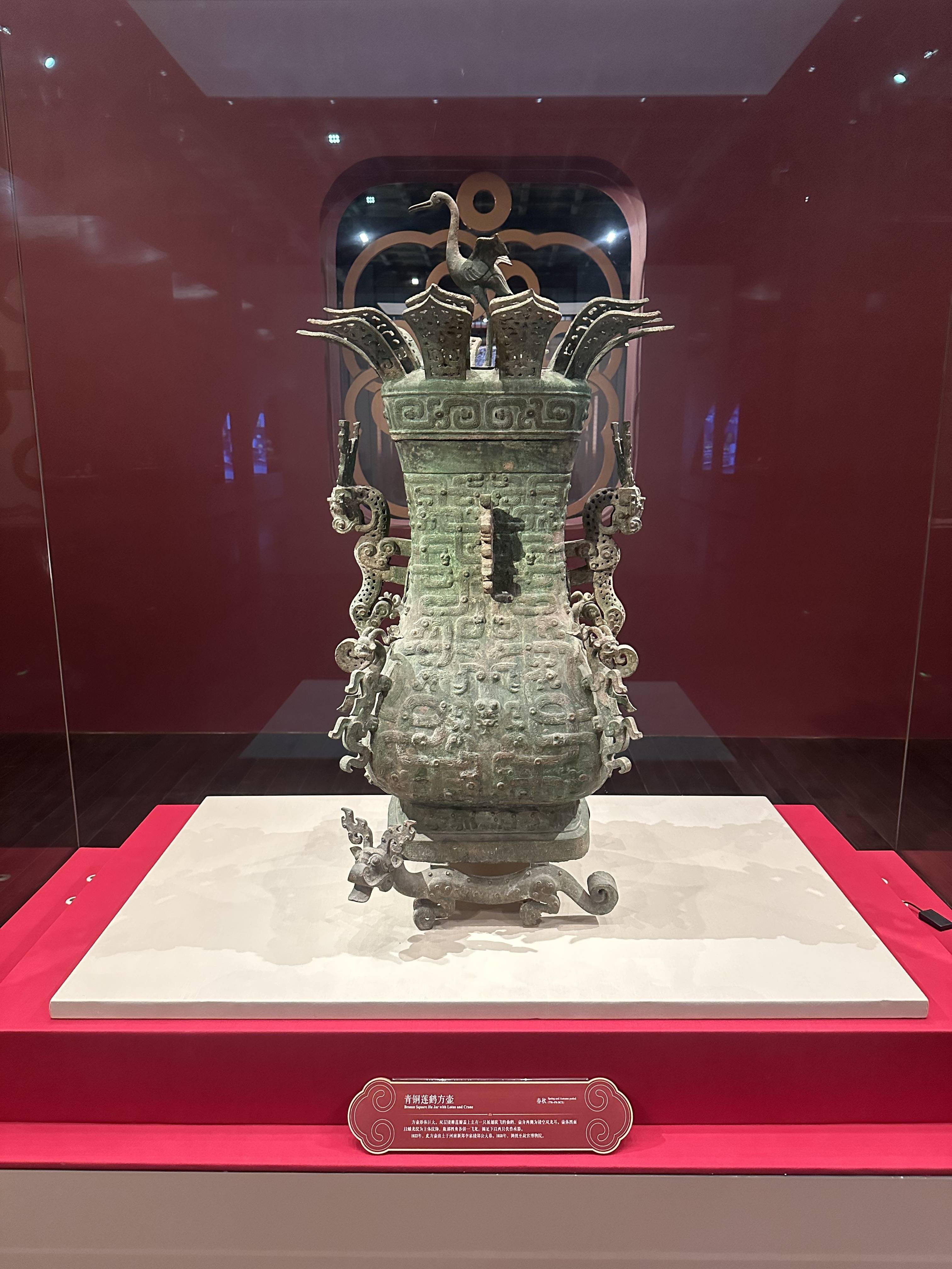 △故宫展出的青铜莲鹤方壶。(总台央视记者朱超拍摄)