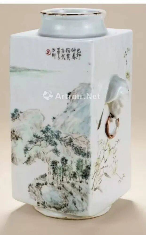 第五、此画为典型的浅绛彩山水画,源自黄公望。网上说他延续了新安画派风格,注重笔墨意趣,看此画正是如此。对比2012中拍国际秋拍“少轩氏浅绛山水花鸟纹琮式瓶”(题款:己卯仲春仿黄子久画意,少轩),二者均是典型的新安派山水。有文章说他“青蓝基调,将原色与混合色的兼用把握到极致”、“流露出的是全景观、整幅画面的雅观”、“山水取法明代沈周、沈士充、近代钱维城、黄慎笔意,亦现任预一路。”