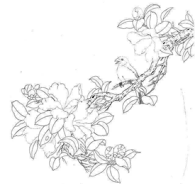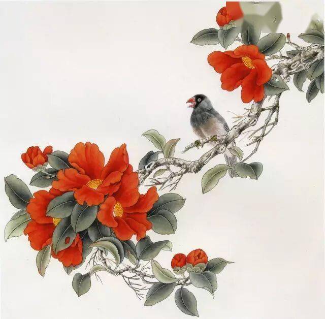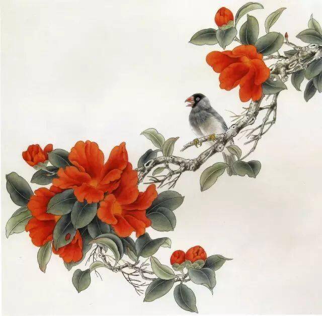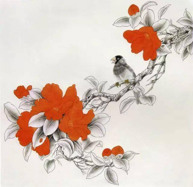 画中是山茶花,颜色很是艳丽,因此文鸟的色彩就减弱一些,以红色的喙与花有个呼应。山茶花以红色为主,所以勾线时可用中墨勾花,重墨勾叶,浓淡墨勾枝干。细心勾出小鸟,注意各部分用线,刻画出质感。