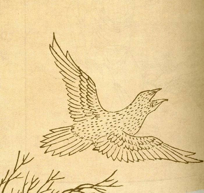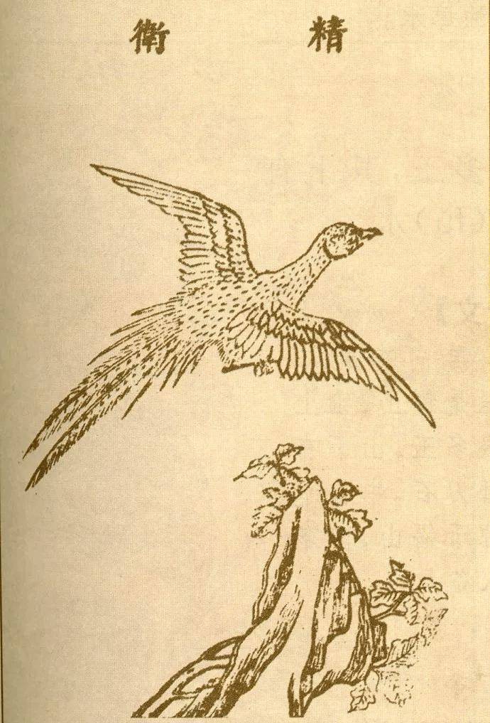 译文:再向北二百里是发鸠山,山上长着很多柘树。山中有一种鸟,形状像乌鸦,头上有花纹,白色的嘴,红色的脚爪,名字叫精卫,它的鸣叫声像在喊自己的名字。精卫本是炎帝的小女儿,名字叫女娃。女娃有一次去东海边游玩,不慎落入海中,再也没有回来,所以就化身为精卫,常常衔着西山上的树枝和石块,想要把东海填平。