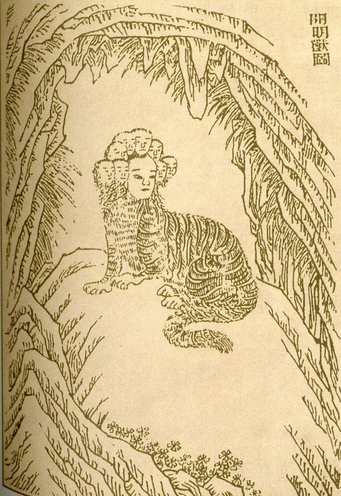 译文:昆仑山南边的深渊深达三百仞。开明兽的大小与虎相似,有九个脑袋,每个脑袋上都长着人一样的脸,面向东站立在昆仑山上。