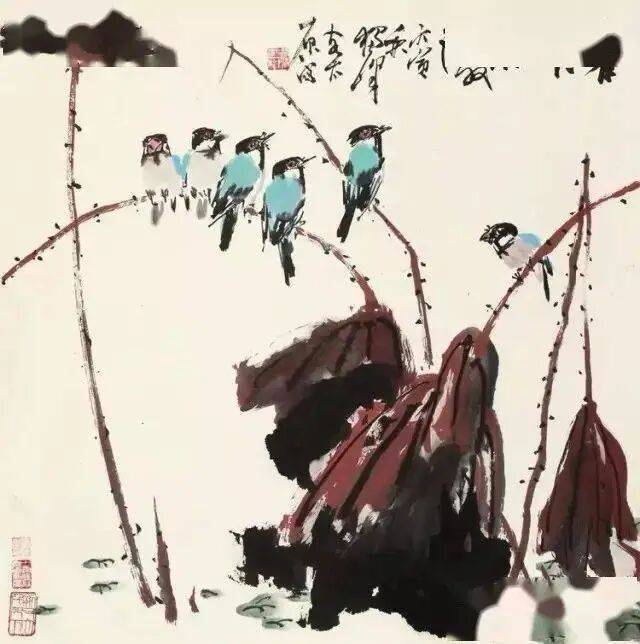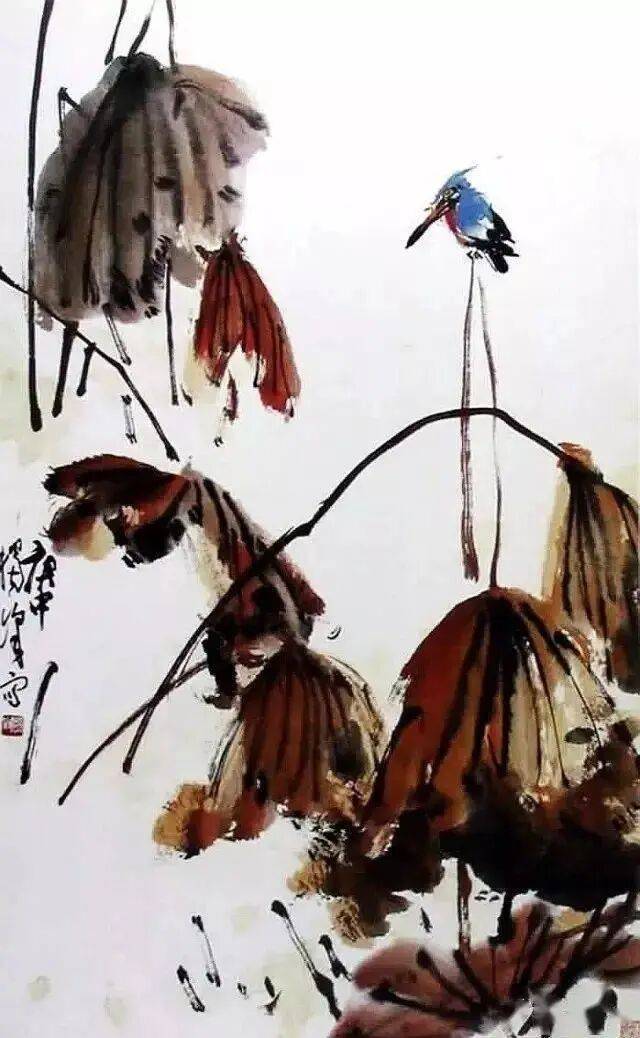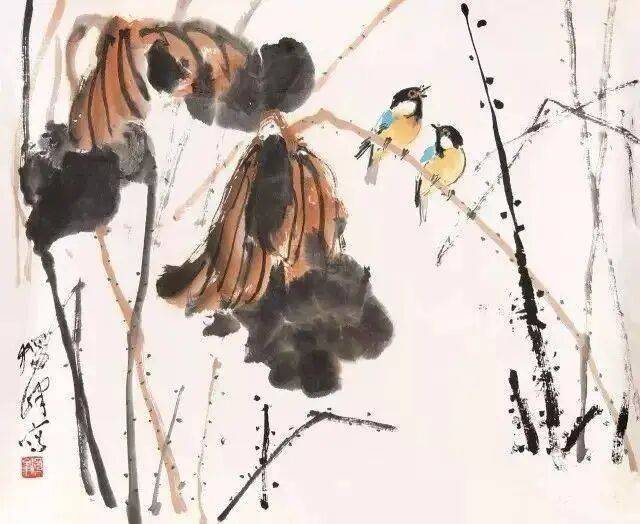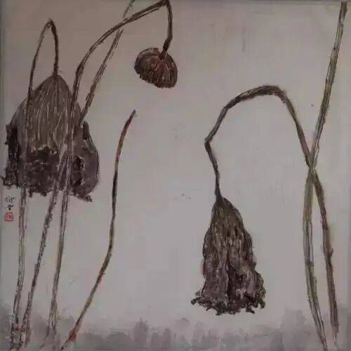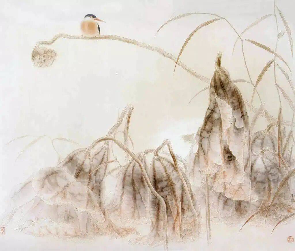 在艺术家的笔下,残荷的枯败里也驻藏着一种神韵,一种风骨。一片破败的残叶,一支饱含着籽实的莲蓬,反而具有了一种荷盛开时所没有的美。