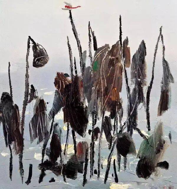 此幅是吴冠中回忆旧作之作,旧作为油画,是吴老回忆起1968年的冬日信步北海,见残荷矗立便幻想有一只猩红的蜻蜓,作为唯一的凭吊者栖息之上。