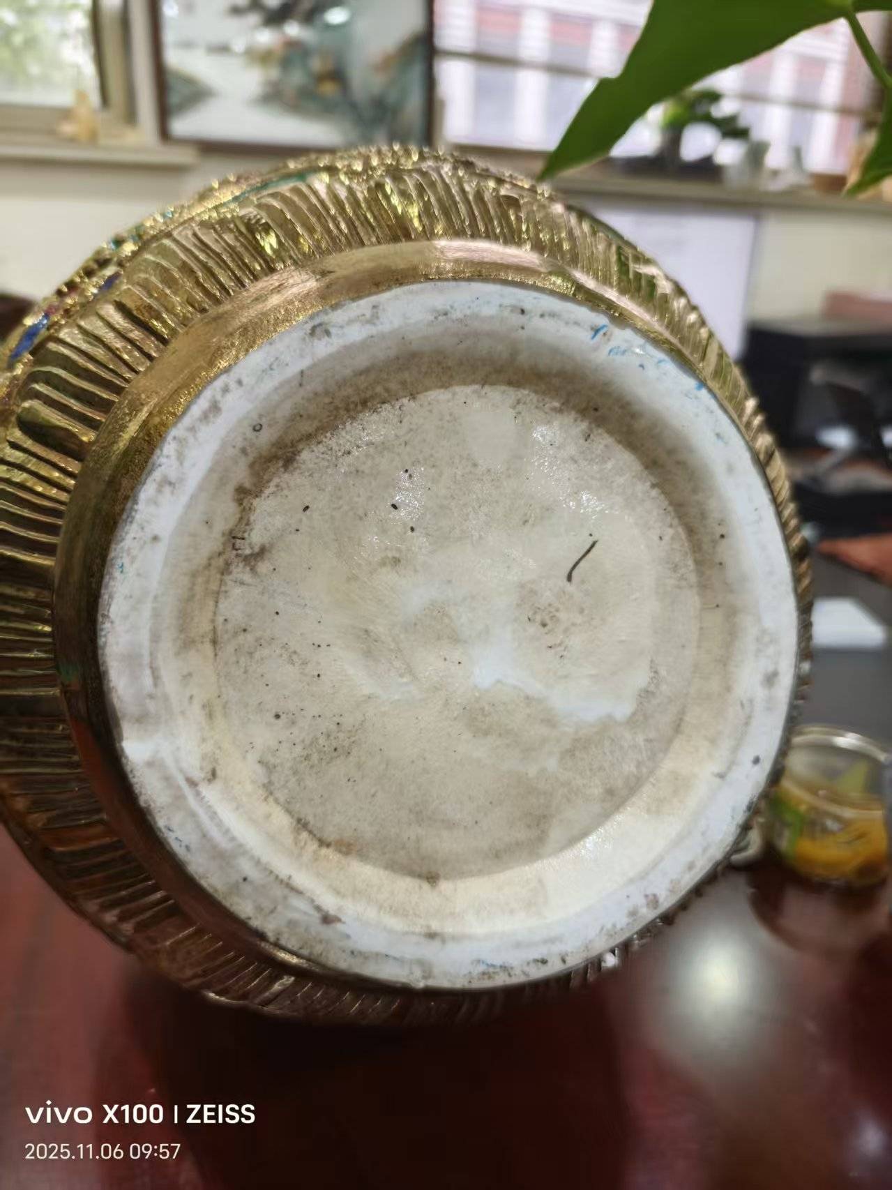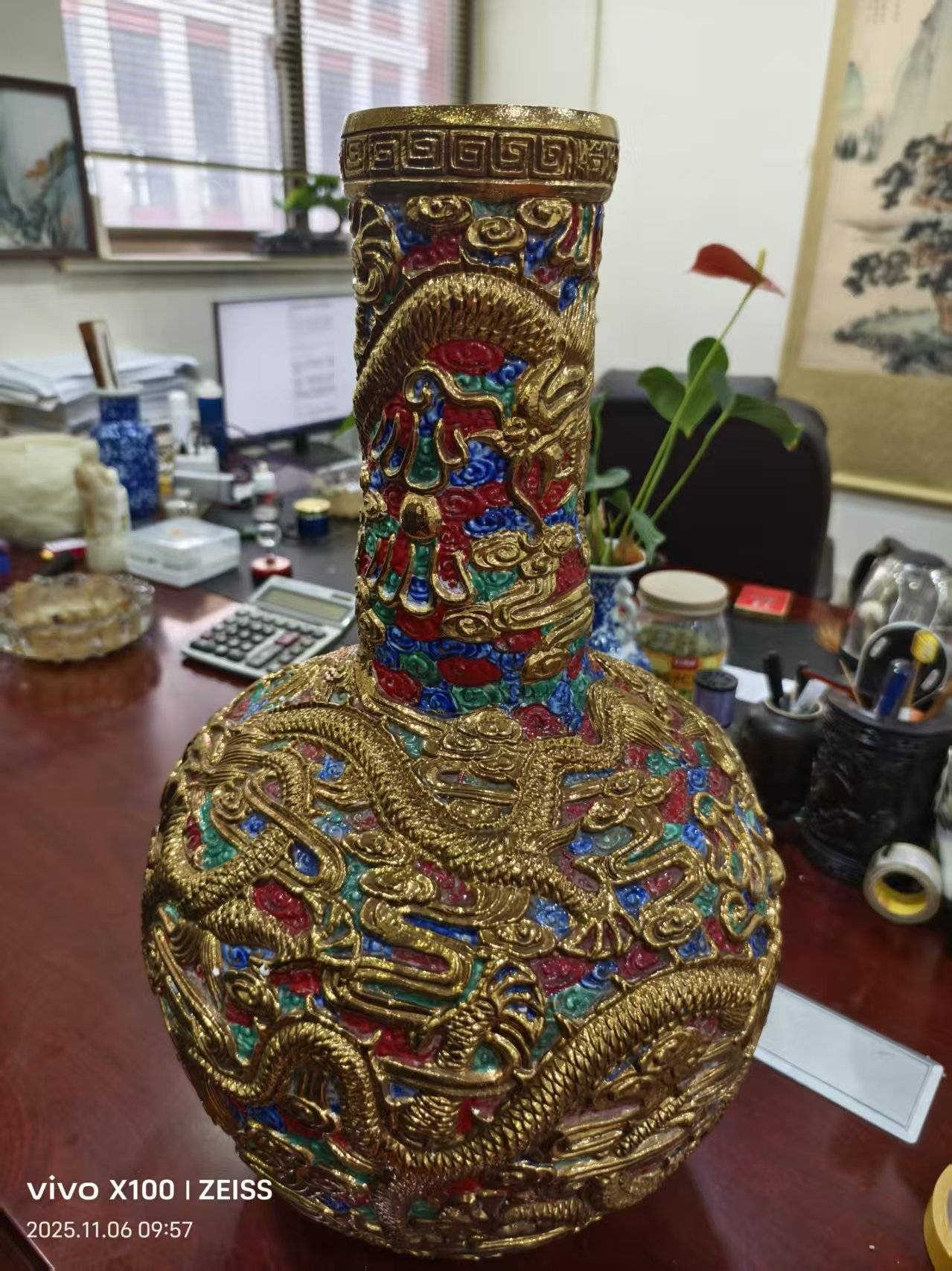 描金: 这是最后一道锦上添花的工艺,也是彰显其皇家身份的关键。工匠用纯金粉或金水,在已经过低温焙烧的五彩图案上,再次勾勒关键线条,如龙的轮廓、鬃发、鳞片边缘,以及云纹、瓶口、底足等部位。描金工艺要求极高,线条必须流畅均匀,厚薄一致。经过再次入窑低温烘烤后,金色才能牢固地附着在釉面上,璀璨夺目,历久不褪。这一工艺极大地提升了器物的豪华感与辉煌气质。