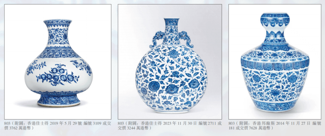 市场上所见的雍正青花同类相似器,均以高价成交。一例为清雍正青花缠枝花卉纹蒜头大瓶,与本品纹饰相同,售于香港邦瀚斯,2014年11月27日,编号181,成交价7628万港币。相同纹饰抱月瓶器形,参考天民楼收藏,并出版于《天民楼珍藏青花瓷器》,上海,1996年,页200-201,图版83号,售于香港佳士得2023年11月30日,编号2711,成交价3244万港币;另有一例雍正青花折枝瓜果纹大尊,于香港佳士得2019年5月29日释出,成交价3762万港币。
