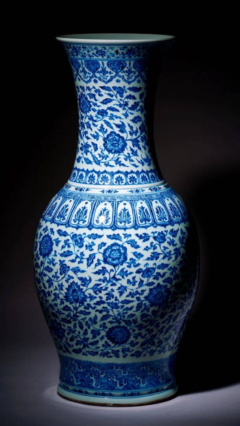 本品雍正御窑青花缠枝花卉纹大尊,便是此一审美与技艺背景下的特例与珍品,它一改雍正御瓷惯常的隽雅秀丽之风,将皇家重器的恢宏之气赫然显现:体型硕大远超同期御瓷,通高可观,口径开阔,器身挺拔,虽为瓷质,却尽显气势磅礴之态,绝非案头赏玩之器,而是专为宫廷大殿、厅堂陈设打造的重器。纵观雍正御窑传世品,此类大尺寸陈设瓷烧造难度极高因为胎体厚重易变形,釉面满施难均匀,青花发色难统一,所以存世数量极为稀少,每一件皆为御窑工匠倾尽全力之作,本品之珍贵,由此可见一斑。