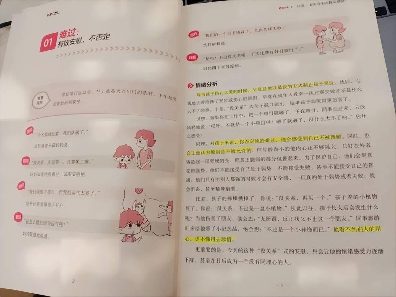 书中列举了,孩子参加比赛输了,很难过的案例,妈妈蹲下来鼓励孩子“没关系,下次比赛好好打就行了!”错误的话术是“没拿奖就没拿奖吧,也犯不着哭啊!比赛总有输赢!”