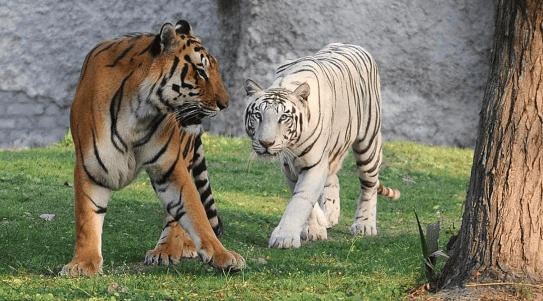 白虎的体色是由于基因突变导致的,使原本橙黄色底黑色条纹的毛发转变成白底黑纹。