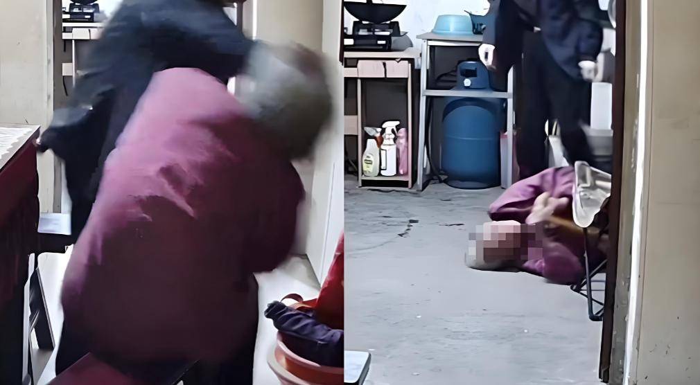 经受不住殴打的老人一边哀嚎惨叫不断,一边蹒跚的抬脚走进厨房试图逃离杨某中,可惜杨某中并没有放过她,而是跟进厨房抓住老人的头发将其摔倒在地,然后抡起拳头和抬起脚对93岁的老母亲又一顿收拾。