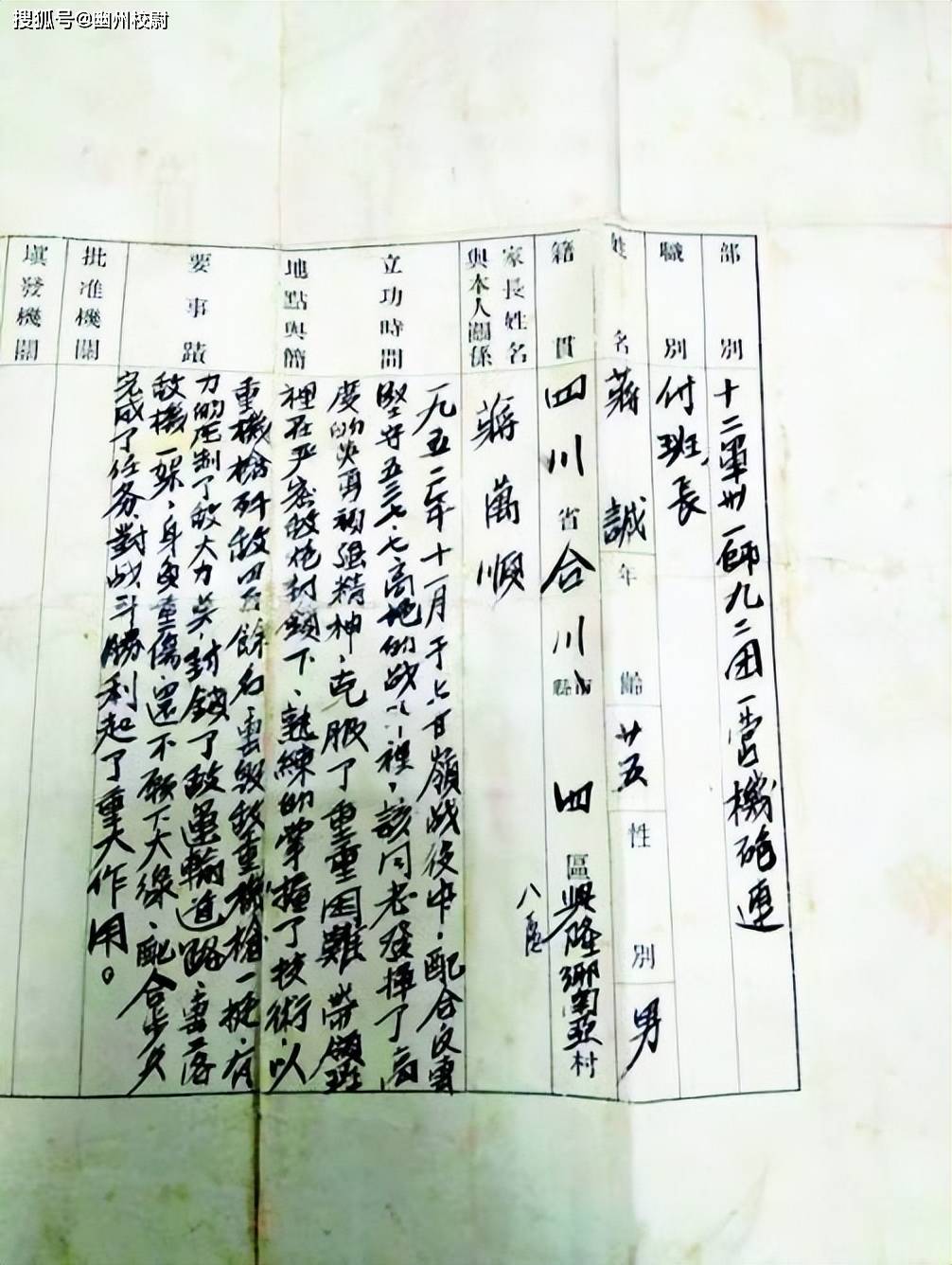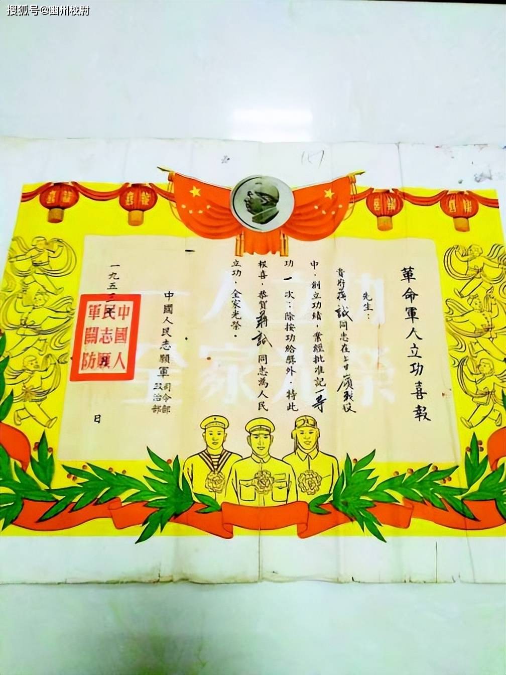 此次银行因为贷款的事,查询档案时,才得知了蒋诚的事迹。此事立刻引起了县里的重视,经过查询,县档案馆找到了一份尘封已久的《革命军人立功喜报》,是由中国人民志愿军司令部、政治部,在1953年联合发出。