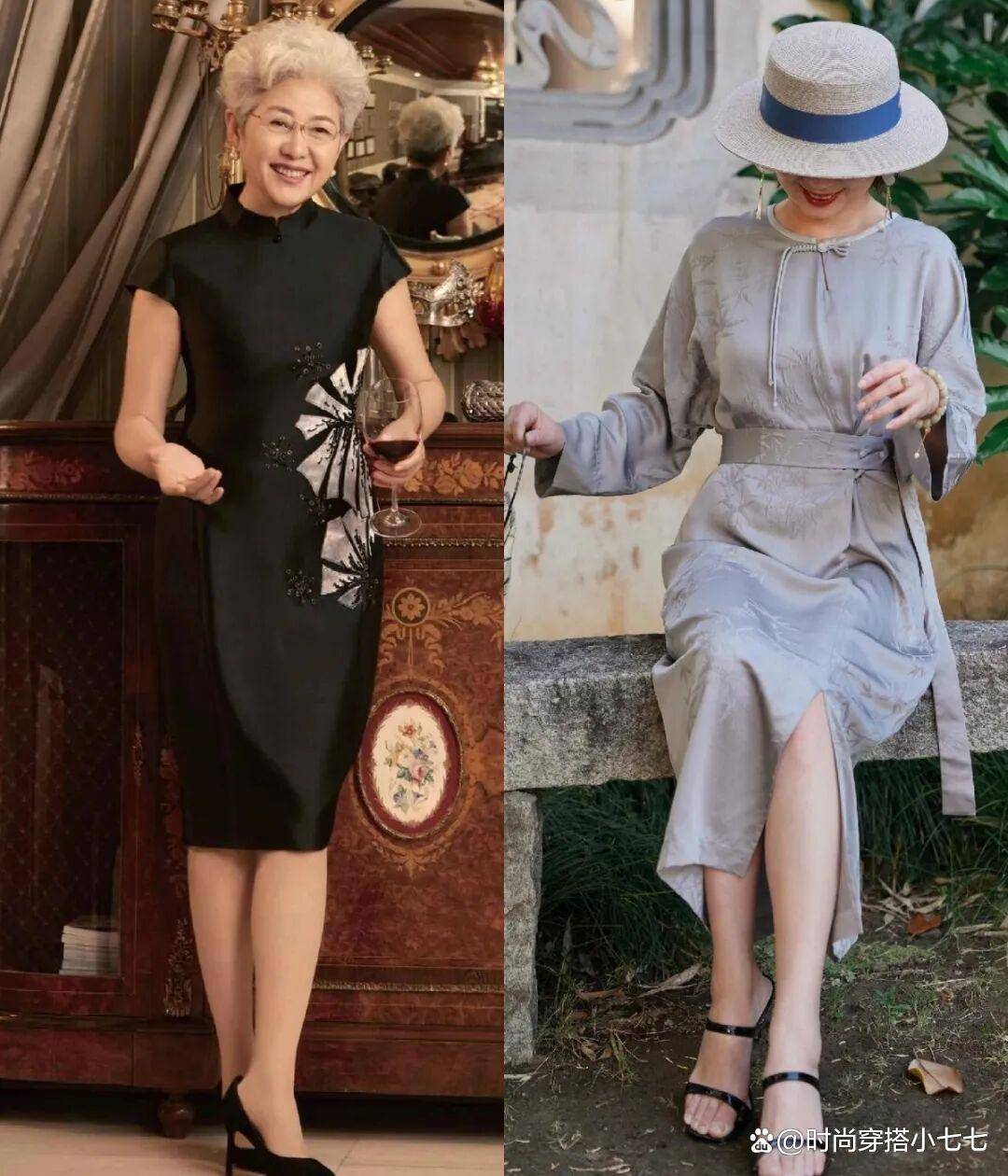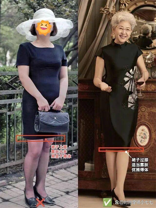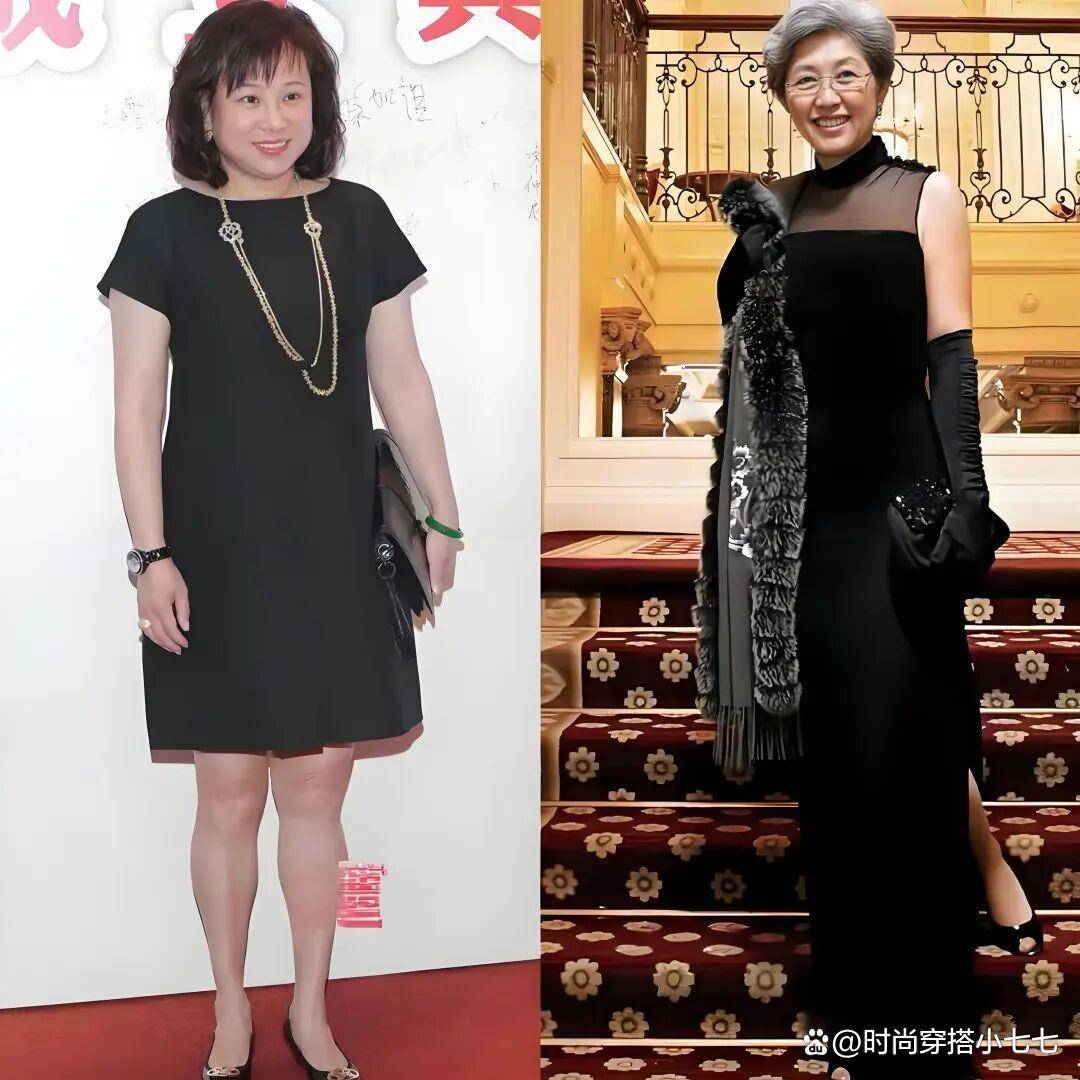 你看下图的对比就知道了,虽然傅莹和博主都是穿的小黑裙,但穿出来的感觉真的不一样。你能清晰地感觉到,短款的裙子穿在5、60岁的女人身上,就有一种“刻意装嫩”的感觉。