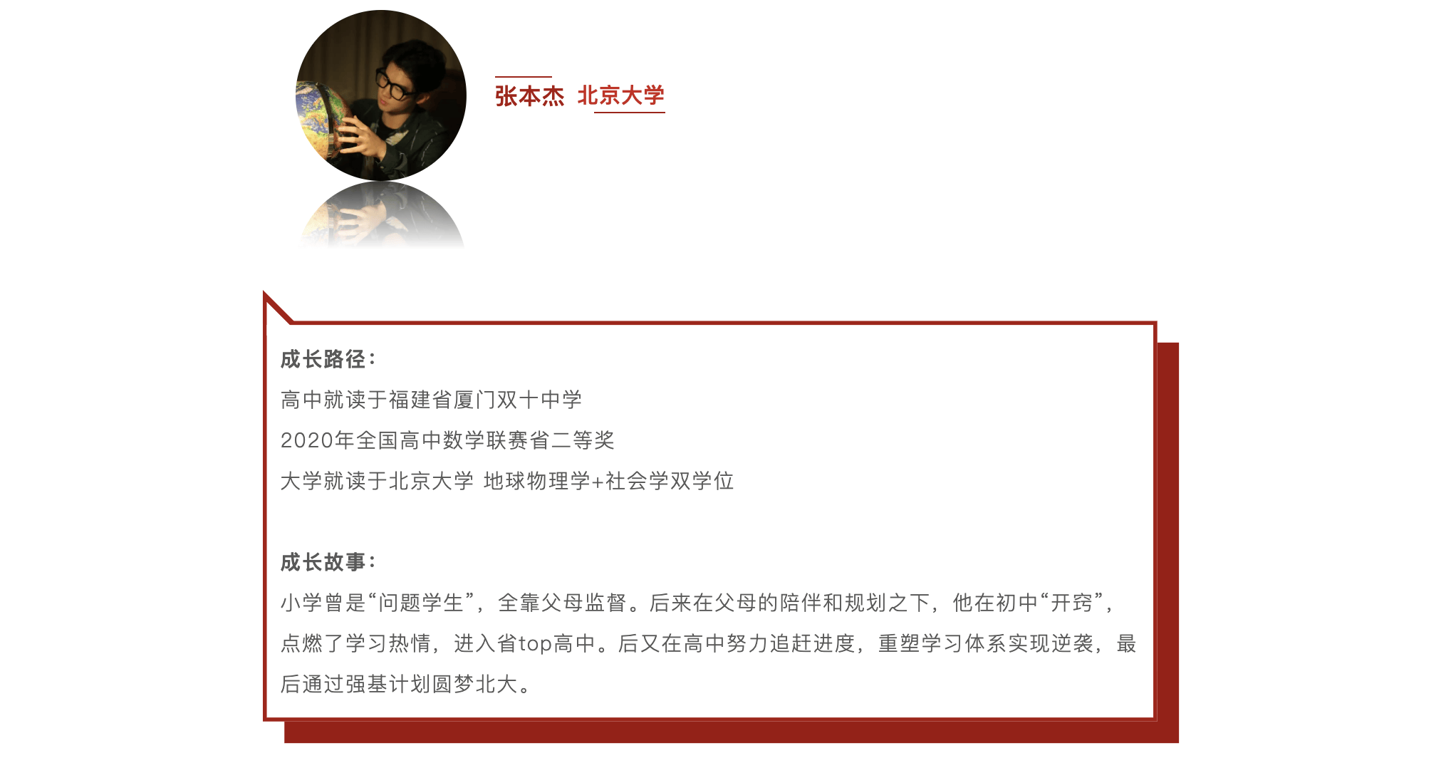 在福建省松溪县读小学的本杰学长和大多数孩子一样不爱写作业,考过70分,三年级时甚至被老师通知父母,自此家长开始严格管教。凭借父母的监督和培养,他在小初阶段都保持着名列前茅的优异成绩,高中突破学习瓶颈期,找到方法实现逆袭,最终成为北大2025级地球物理专业直博生。
