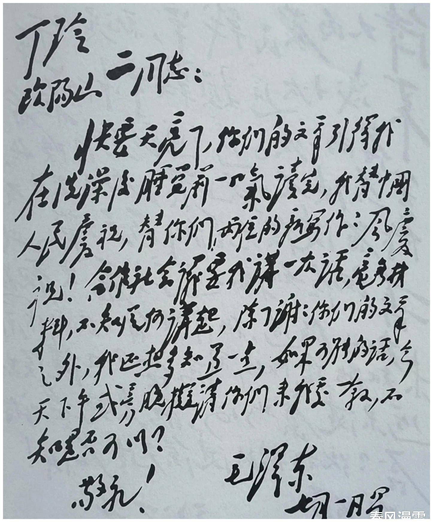 题记:毛主席的书信中,常常会写给多位同志,而这封信正是写给丁玲和欧阳山两位同志的。从这封信的字迹来看,你会发现它与毛主席平时的毛体字迹有很大的不同,尤其是相比其他书信,这封信的字迹看起来更加厚重、饱满,仿佛蕴含着强大的力量。相信很多朋友是第一次看到这封信,毛主席在信中这样写道:丁玲、欧阳山二同志:快要天亮了,你们的文章让我在洗澡后、睡觉前一口气读完。我替中国人民庆祝,也替你们的新写作风格庆祝!合作社会议让我讲一次话,材料准备不足,不知道该从何讲起,除了感谢你们的文章,我还想了解更多。如果可以的话,今天下午或傍晚希望能邀请你们来我处谈一谈,不知是否方便?敬礼!毛泽东 七月一日早。从这封信中,我们可以感受到毛主席的亲切关怀,而他的字迹则足以让人留下深刻印象。接下来,就让我们一同来欣赏这封信吧。
