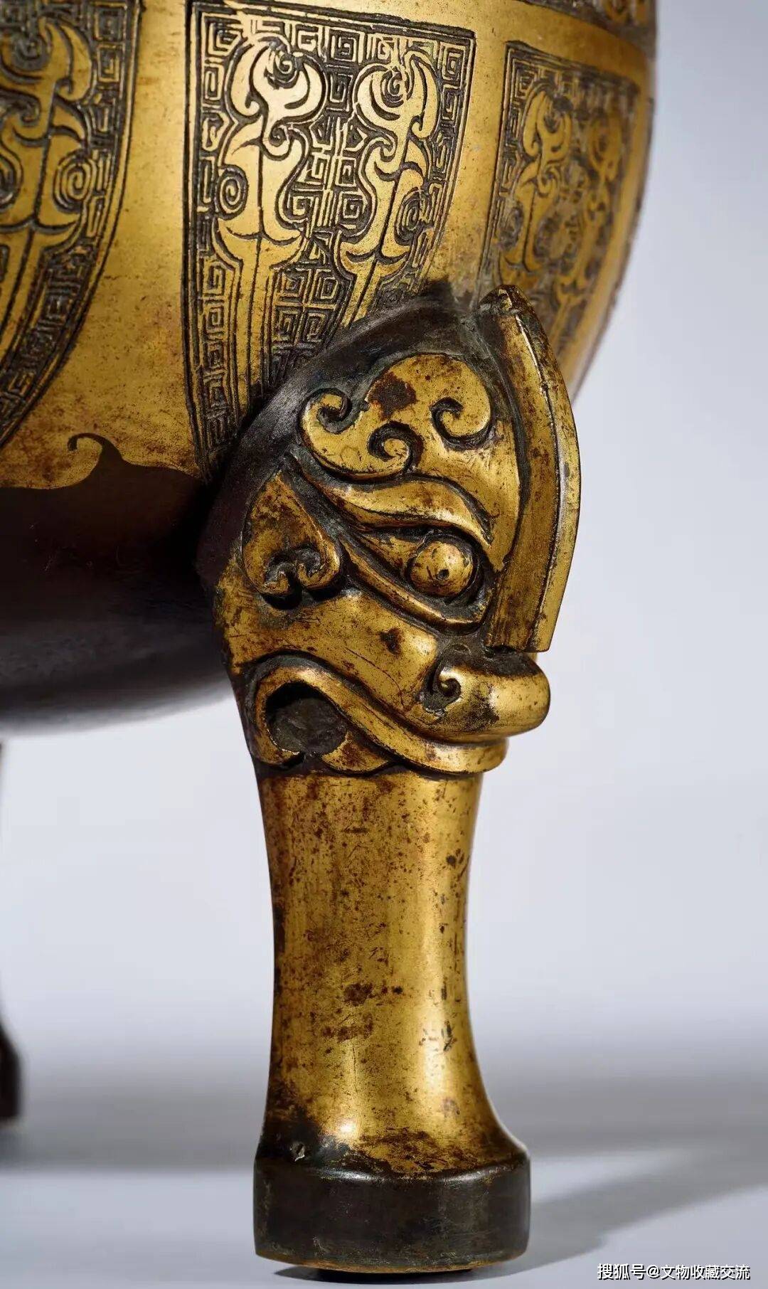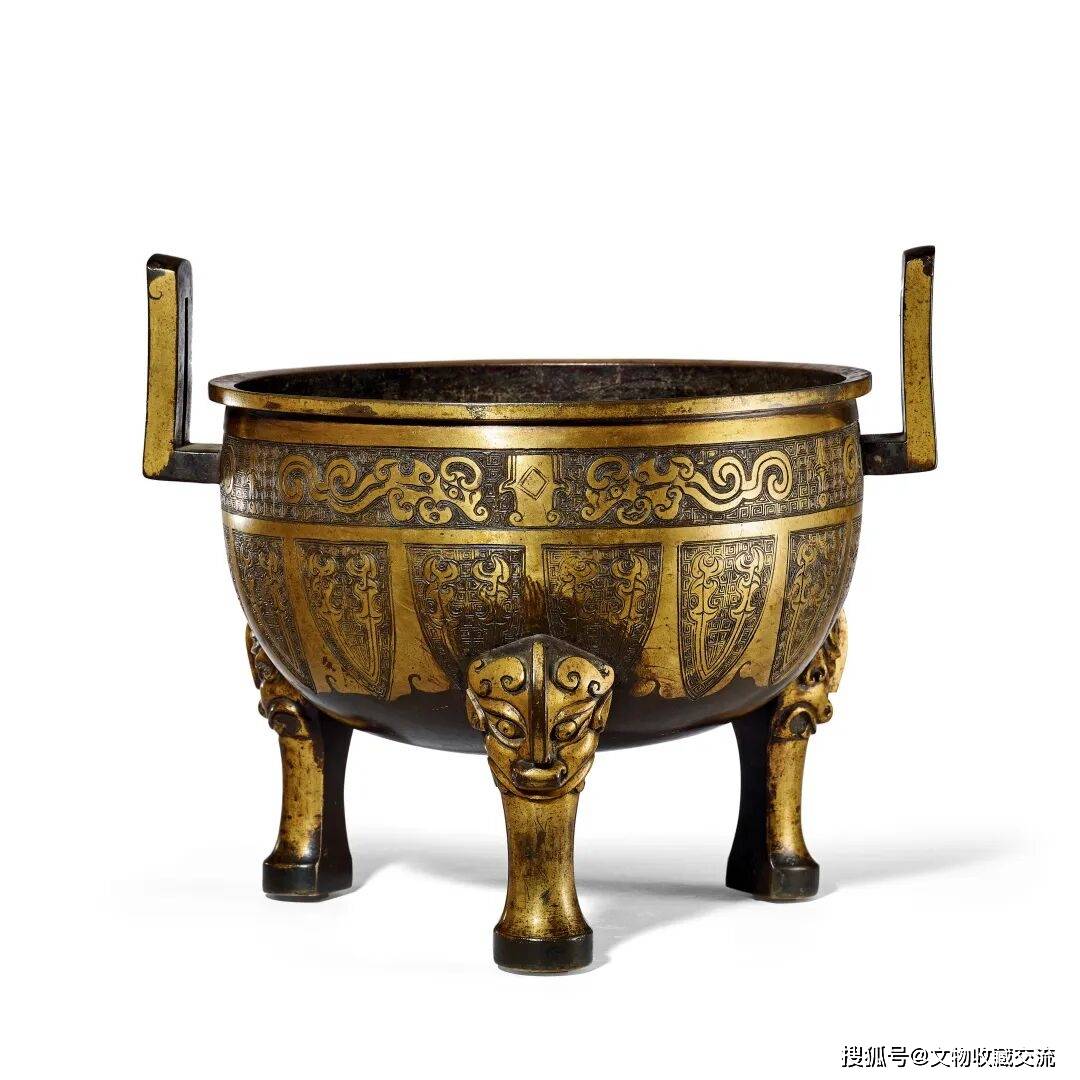 此鼎即仿宋人博古图中商周彛鼎略加化裁而成,造型敦实,唇口折沿,颈部略收,腹部圆鼓至底渐收,腹下承三兽首衔高柱足,肩部对塑冲天方耳,其势外撇。腹部分两层錾刻纹样,皆以细密云雷纹为地,上腹部饰两两相对的夔龙纹,下腹部则为变形蝉纹,整器通体鎏金,金水厚重沉稳,局部略有漫漶,可见岁月流逝。