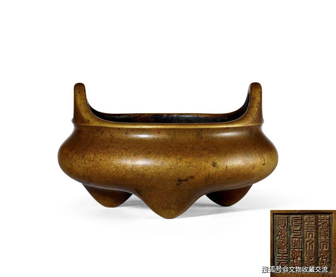 拍品铜质缜密,造型圆浑。皮色为藏经纸色,深沈、高古,因色近佛家经典,故乃铜炉中首色,为世人所重。炉身宽阔厚重,下承三乳足,口沿出双冲耳,线条优雅,张弛有度。