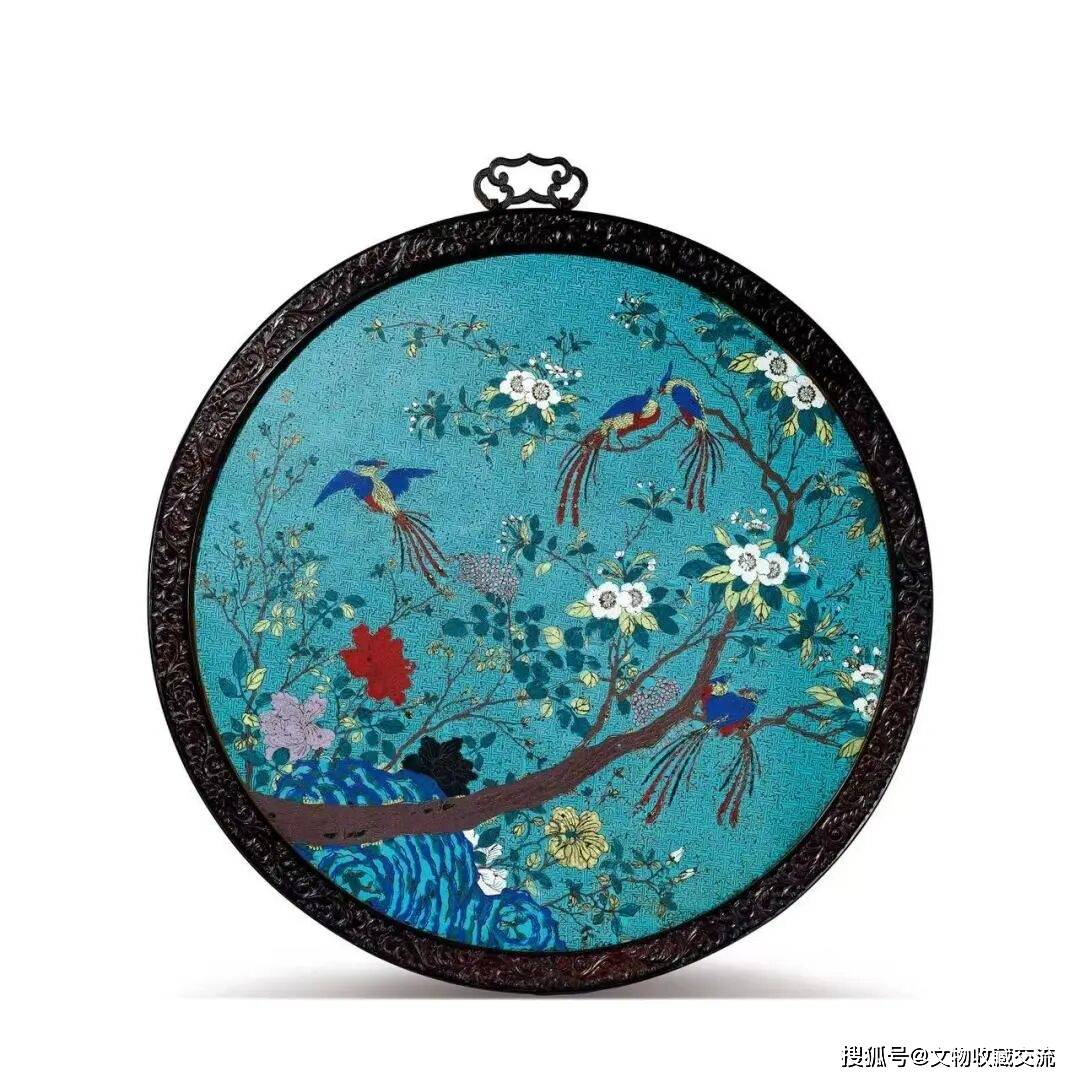 挂屏为圆月式,环以红木框。屏心装饰花鸟图,以掐丝工艺焊接出图案轮廓线,再于轮廓内填各色珐琅料。
