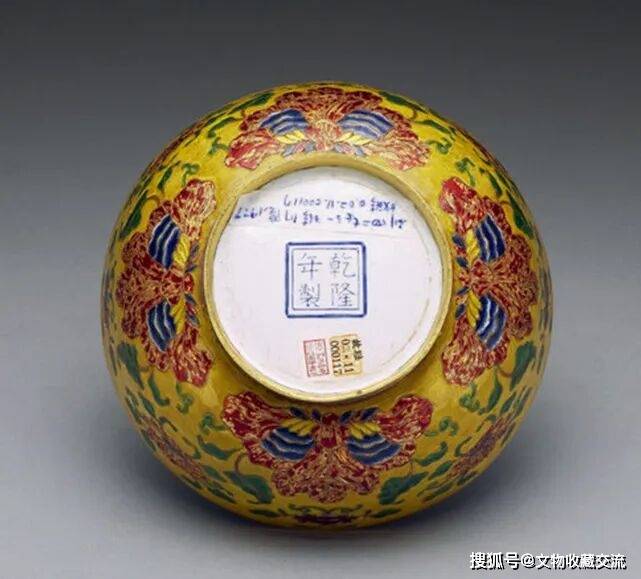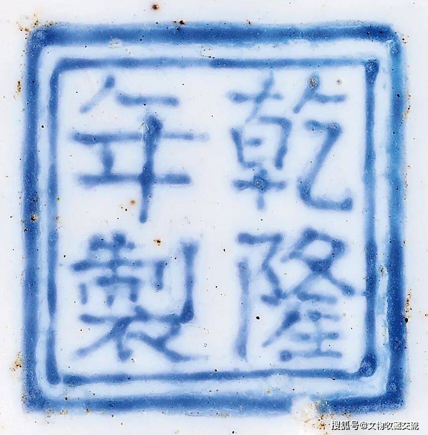 底部施白色珐琅釉,中心画珐琅蓝色“乾隆年製”双方框四字楷书款,是清宫珐琅器上的标准乾隆款。