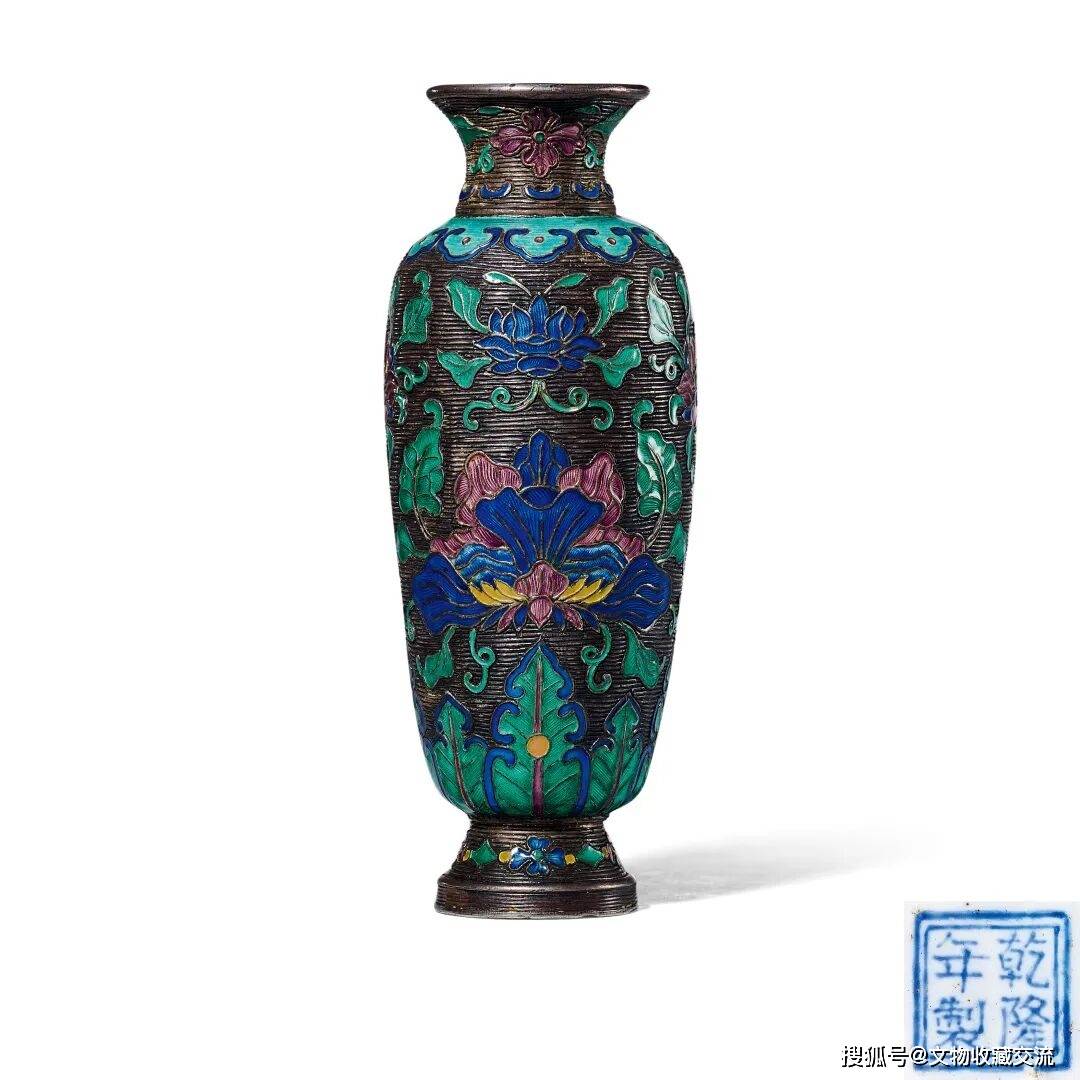 全器采用银胎錾胎填珐琅工艺制作,通体以錾刻线条纹为地,其上錾刻精美花纹,以蓝、绿、粉、黄等釉色填彩,设色纯正饱满。颈部和足墙饰花卉纹,肩部饰如意云头纹,近足处饰蕉叶纹;腹部饰六朵花卉纹,四朵小花均匀装饰于瓶身上半部,两朵大花对称装饰于瓶身下半部;莲花盛开,缠枝纹翻卷自然,姿态鲜活,与华美绚丽的釉料、线条底纹完美结合,倍添华绮。